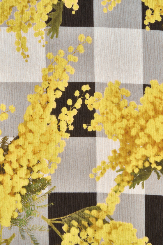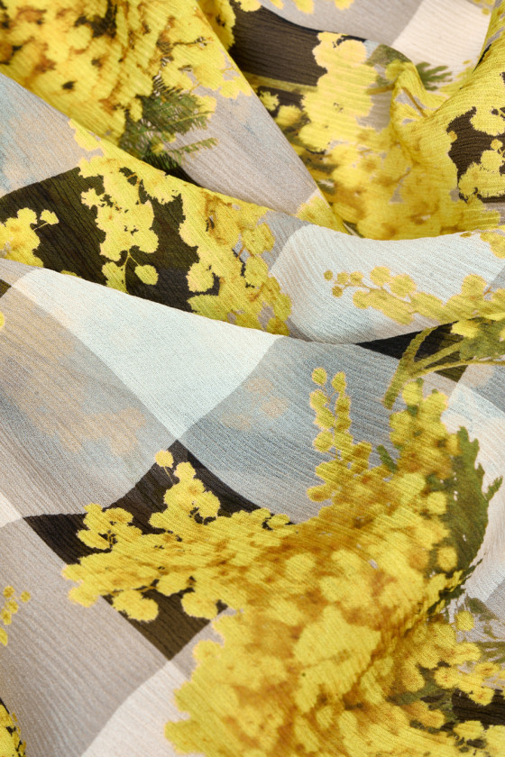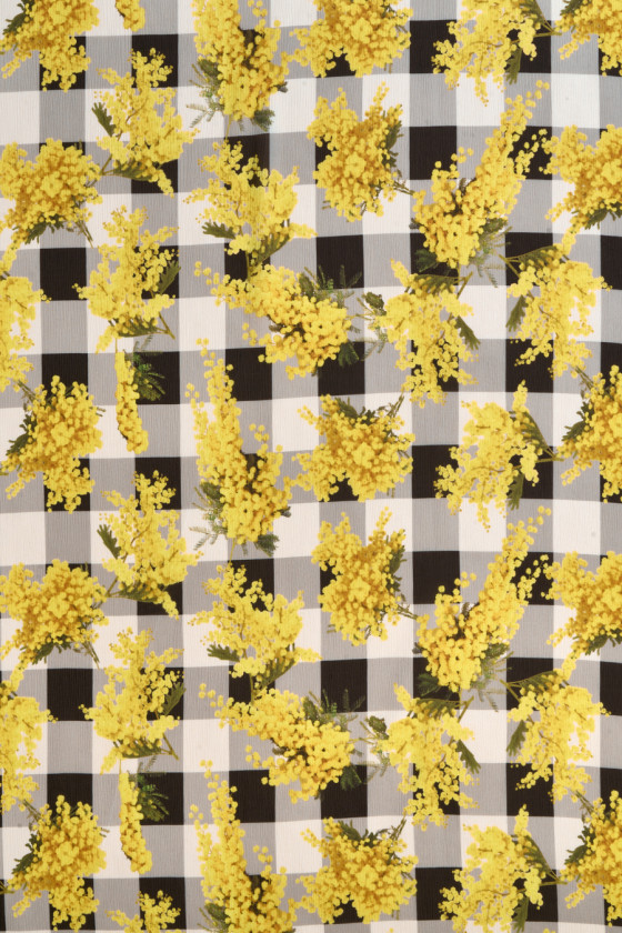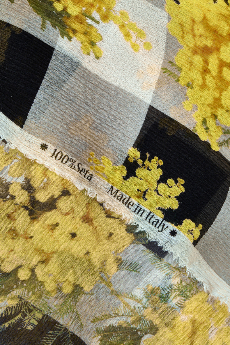 Italiensk 100% silkekrøllet chiffon med et motiv af gule små blomster arrangeret i form af en buket på en sort, grå og flødeternet baggrund. Stoffet er let, gennemsigtigt, luftigt, elastisk - det fungerer på tråde. Et perfekt forslag til syning af en luftig kjole, bluse eller tørklæde.