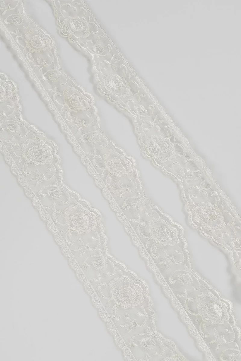 Italiensk blondetape i ecru farve, afsluttet med en tand på den ene side. Et smukt motiv af rose og små blade. Perfekt til efterbehandling af bryllupsstoffer og Boho-styling. Bredde: 4.5 cm