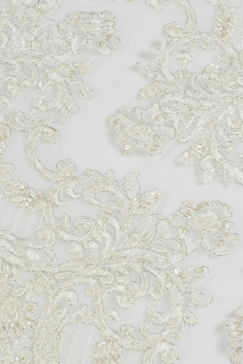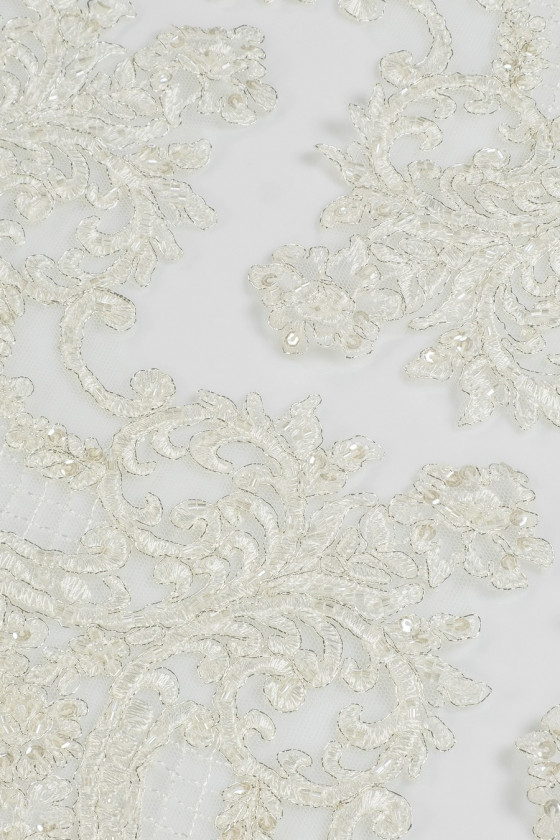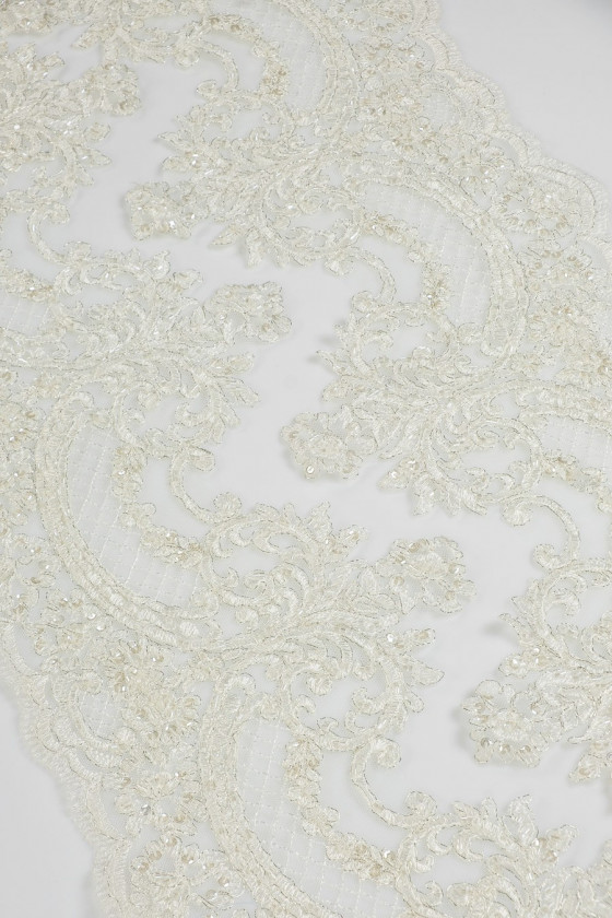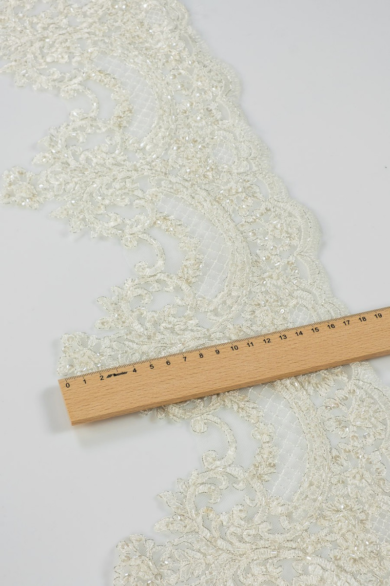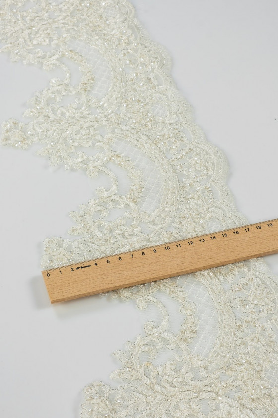 Italiensk sytilbehør tape i ecru farve med sølvtråd, afsluttet med en tand på den ene side. Et smukt, stort motiv dekoreret med små perler. Ideel til efterbehandling af bryllups- og aftenstoffer.