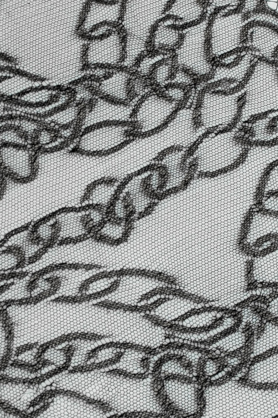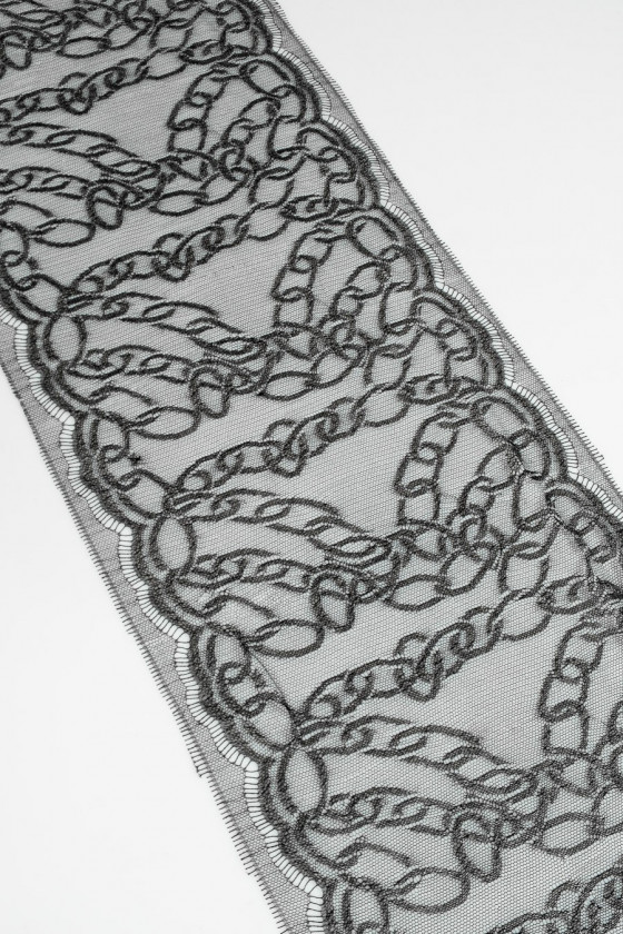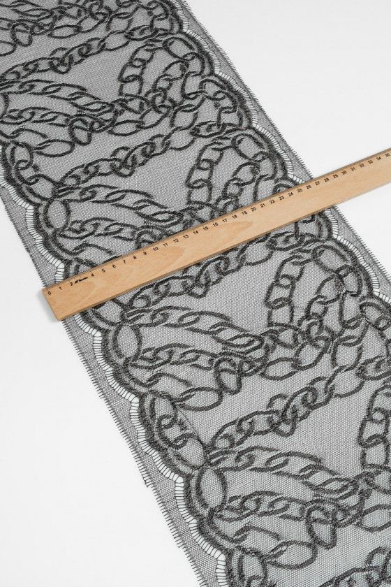 Italiensk blondetape i sort med sølv lurex tråd. Færdig på begge sider med en tand (skal udskæres). Kædemotiv.