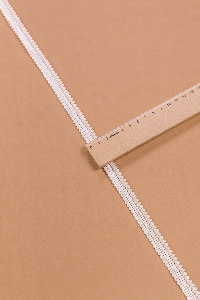 Italiensk haberdashery tape i perlefarve. Motivet af interessante "sløjfer" lavet af snor. Ideel til efterbehandling af bryllups- og bomuldsstoffer.