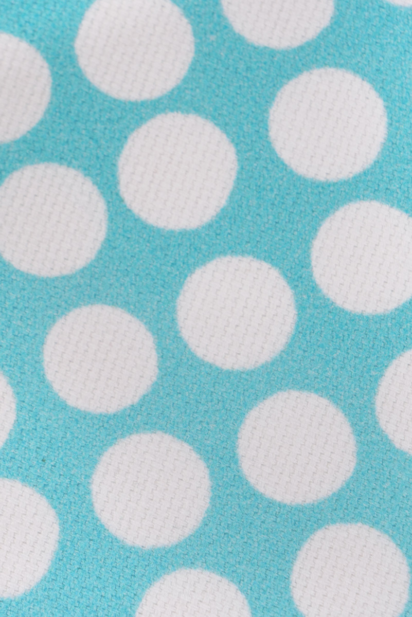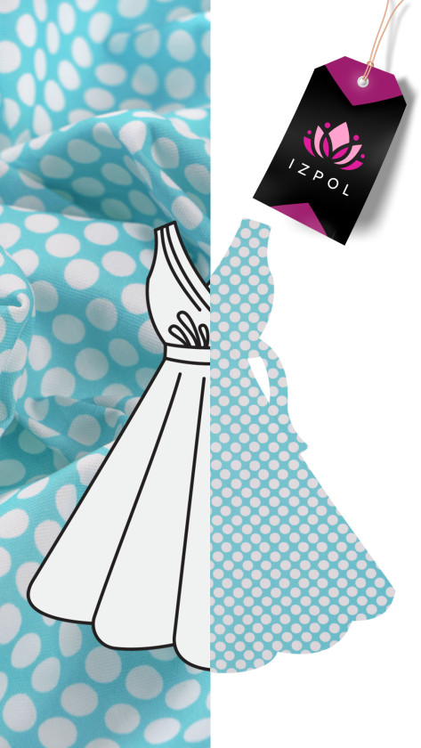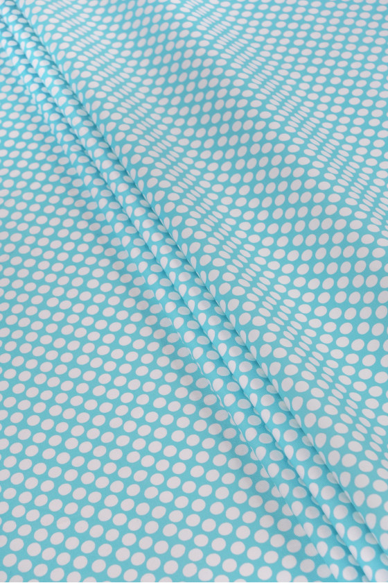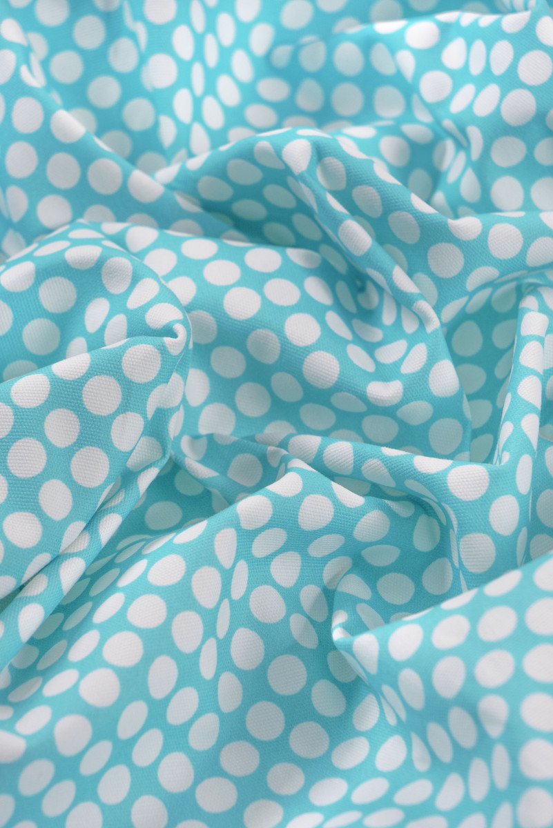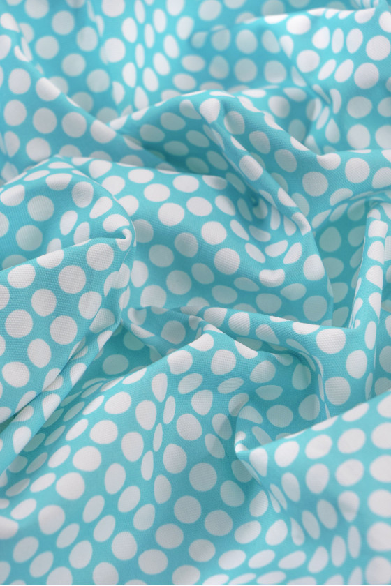 Italiensk bomuldsstof - elastik i turkis med et tæt motiv af hvide prikker (1 cm). Stoffet er tykkere, vævningen ligner denim, meget elastisk. Perfekt til syning af bukser, nederdel, kjole eller shorts.