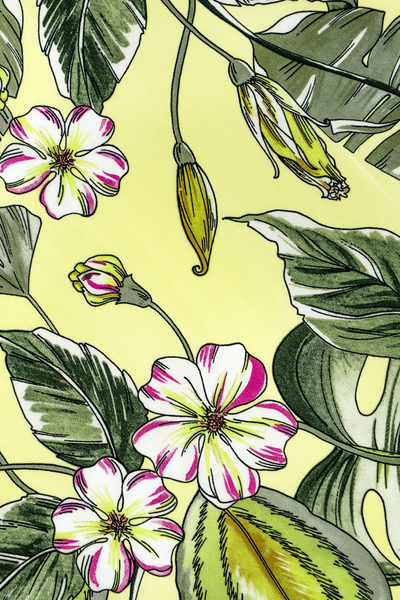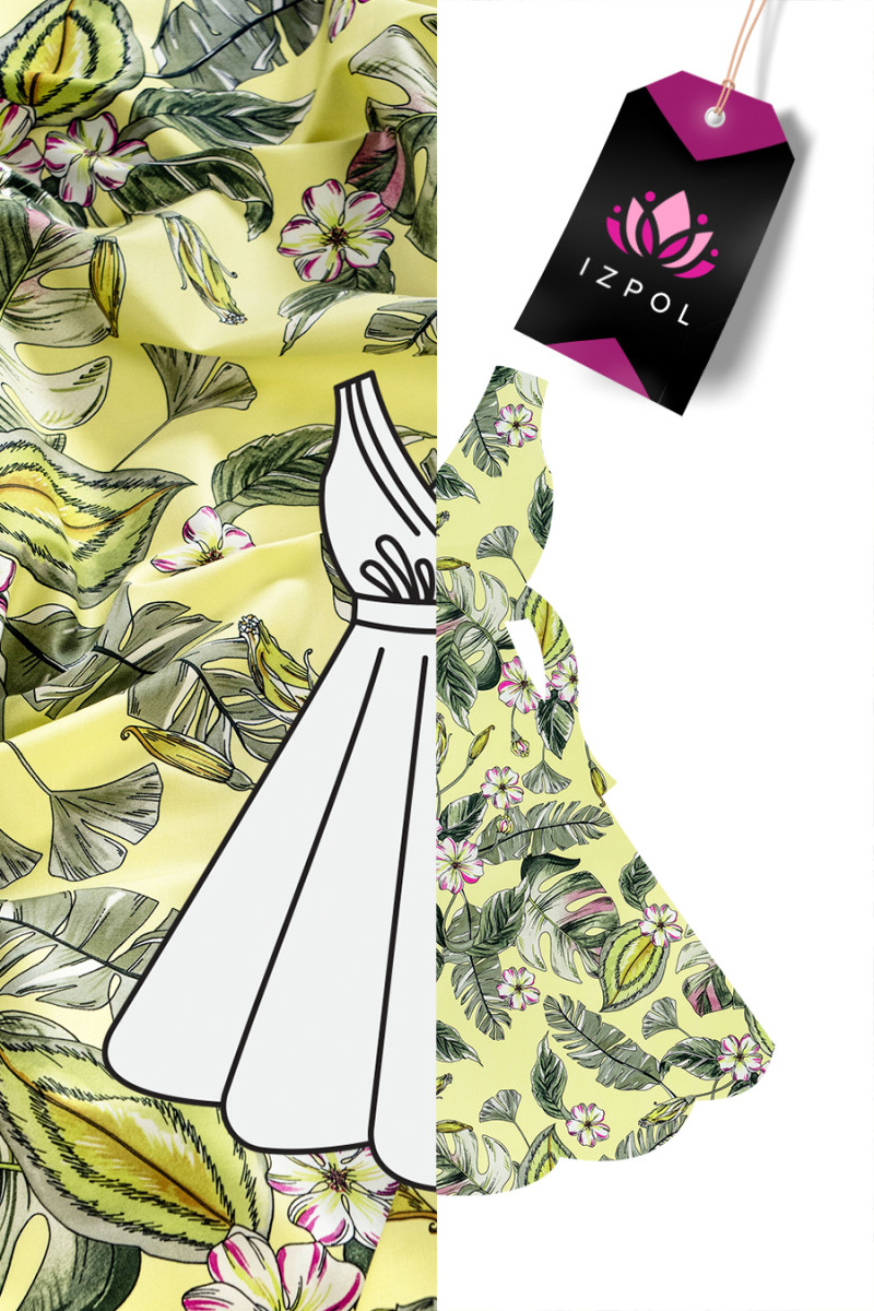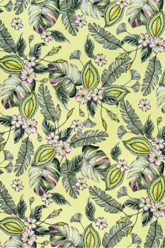 Italiensk bomuld, elastisk stof i citron med et motiv af eksotiske blade og blomster. Bomuld er en 100% naturlig fiber. Bomuldsstoffer er holdbare, slides ikke hurtigt, bevarer deres egenskaber i lang tid, er perfekt åndbare, åndbare, hvilket giver høj brugerkomfort. Elastisk, mat, uigennemsigtigt stof - perfekt til syning af kjole, bukser, nederdel eller shorts.