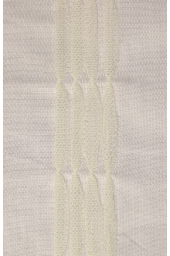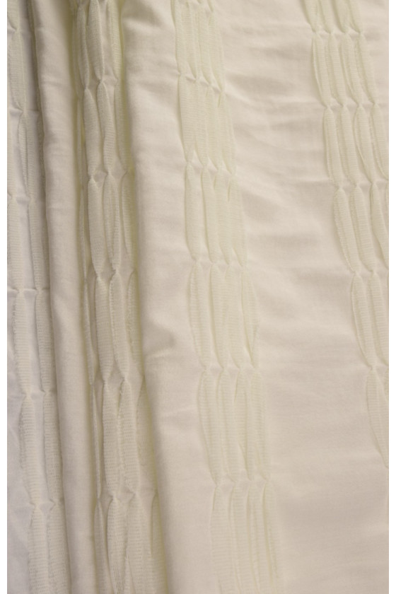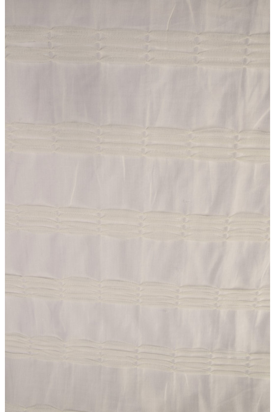 Italiensk 100% bomuldsstof i écru-farve med påsyede tylbånd, der danner vandrette striber ca. 3 cm brede, hver 6. cm. Tyndt, let gennemsigtigt, ikke-elastisk stof - perfekt til syning af en sommerbluse, kjole eller nederdel.