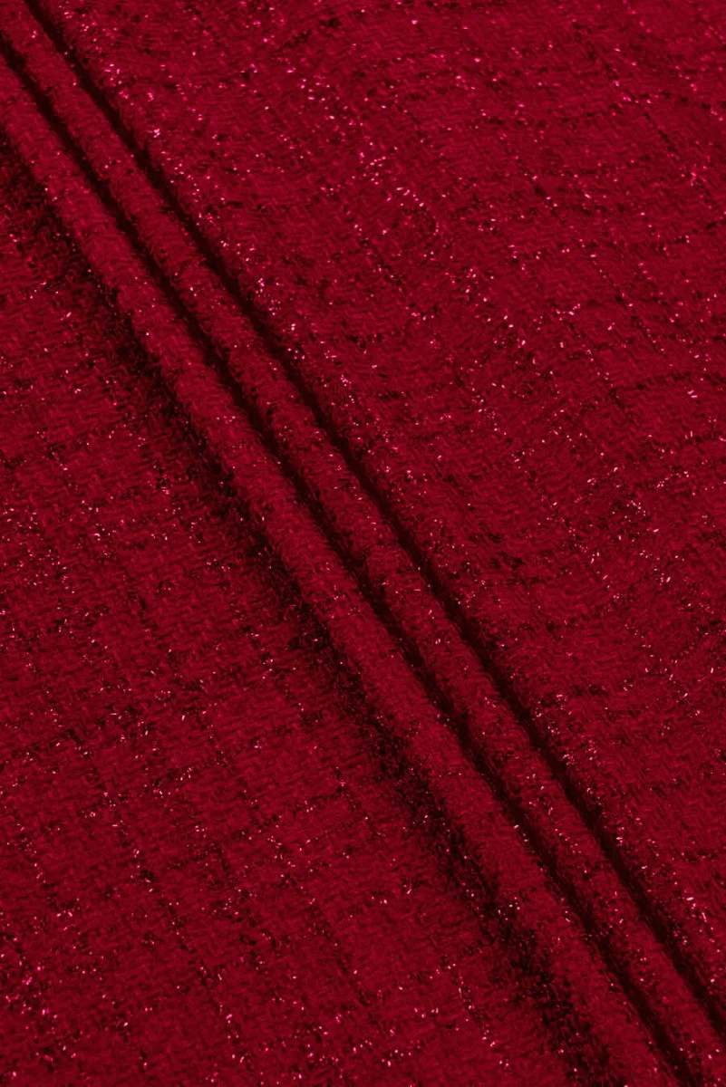 Italiensk chanel kostume stof i mørkerød med en rød lurex tråd vævet ind i det. Perfekt til sæt som: jakke + nederdel eller kjoler. Den kan også bruges til at sy en tynd overgangsfrakke.