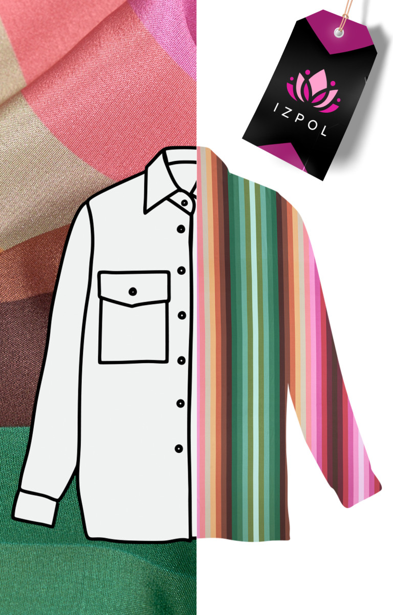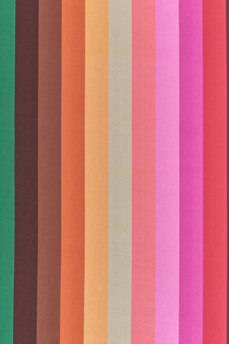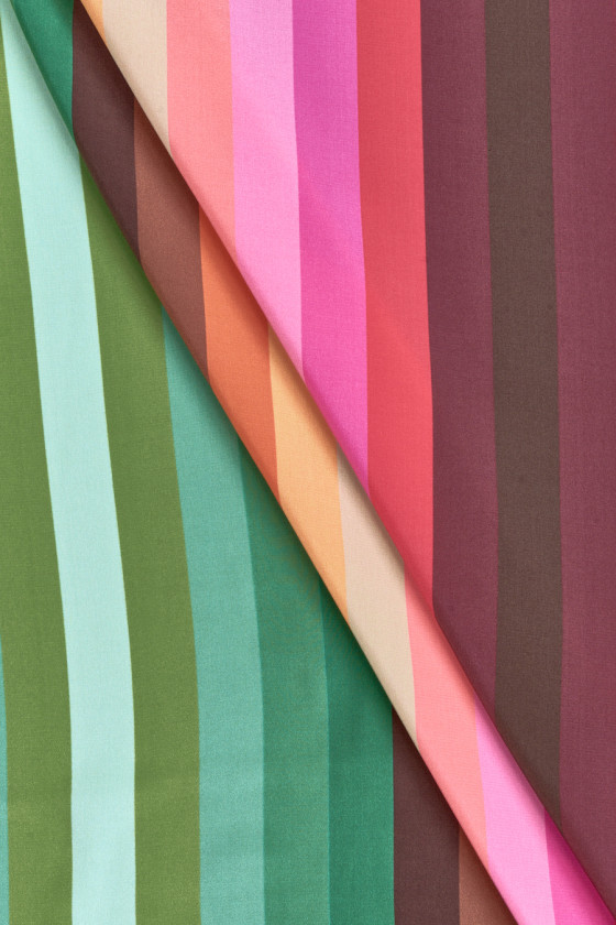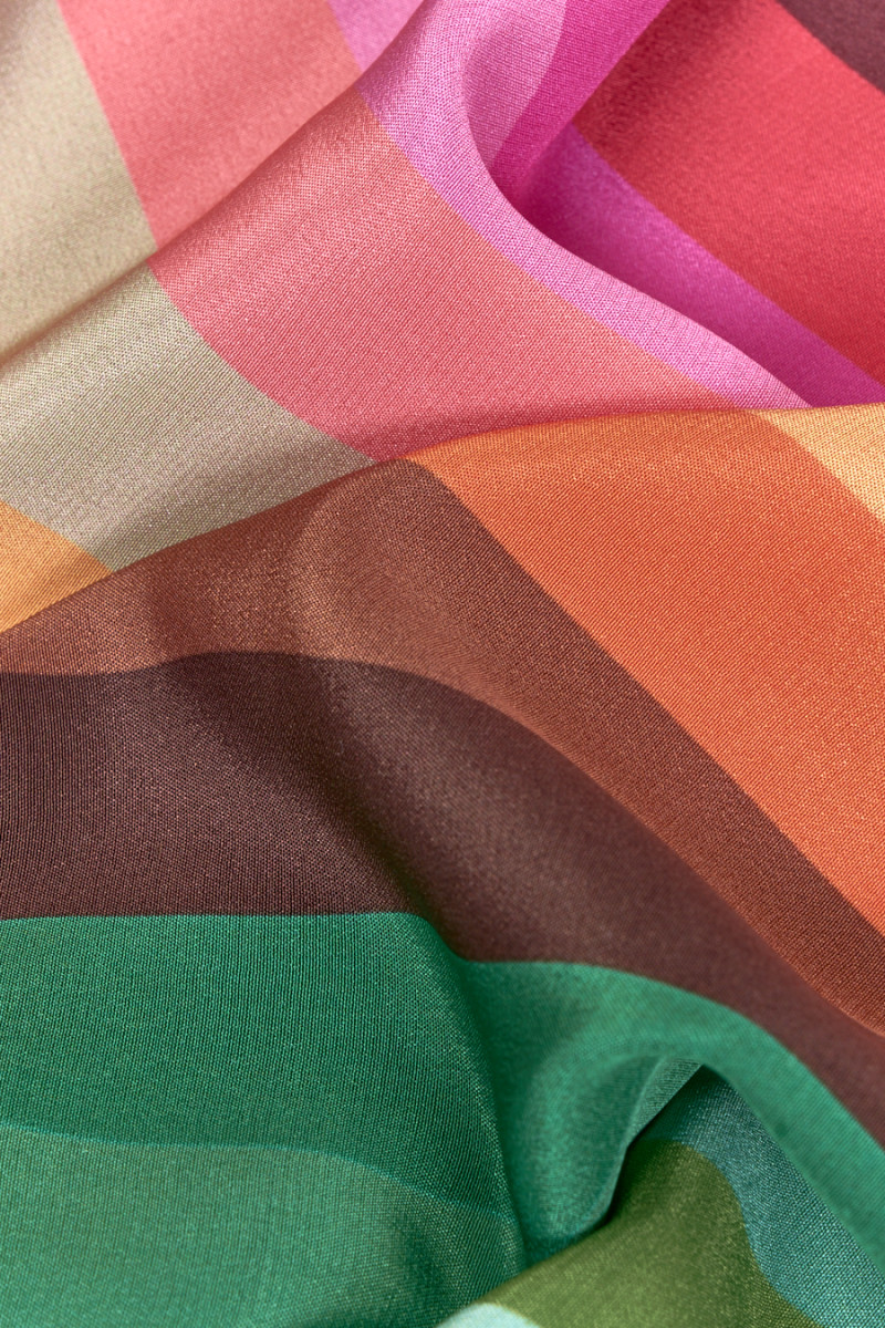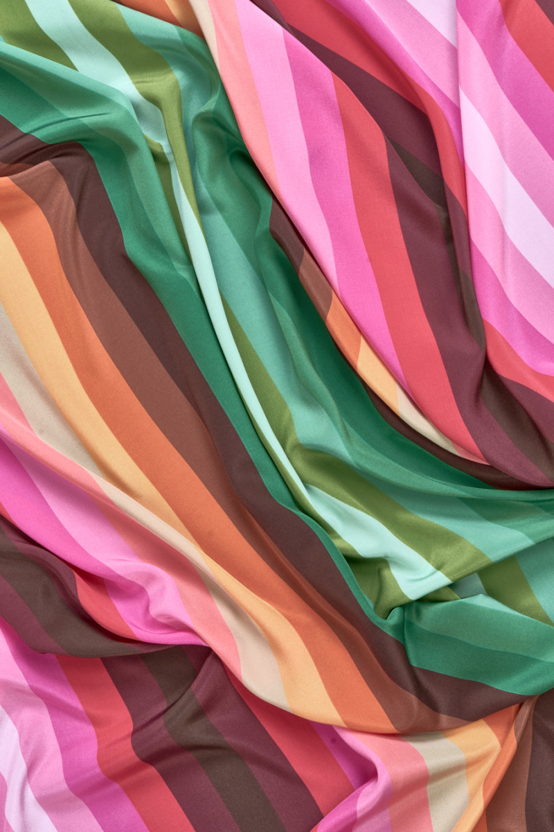 Italiensk 100% silkecrepe med farverige striber. Midten af stoffet er lavet i grønne farver, går til kanterne, det går gennem brun-orange farver op til forskellige nuancer af pink - striberne er 2,5 cm brede. Stoffet kommer fra samlingen af en velkendt modedesigner. Et fantastisk forslag til skøre personligheder, der kan lide at skille sig ud.