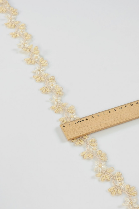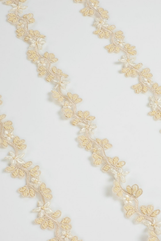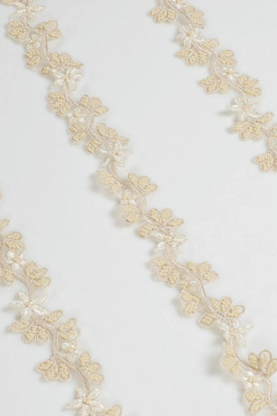 Italiensk haberdashery tape i lys beige og ecru. Et motiv af blomster og blade broderet med perler. Ideel til efterbehandling af bryllups- og aftenstoffer.
