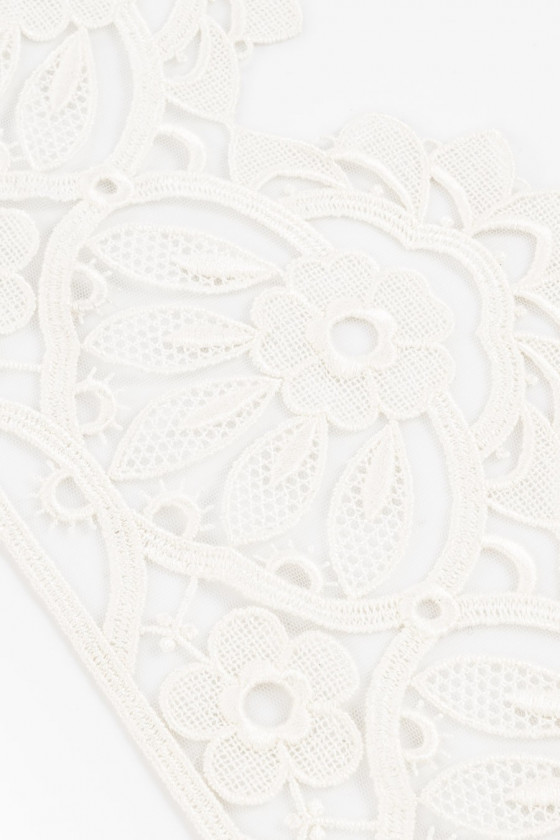 Italiensk guipure tape i ecru farve. Et smukt blomstermotiv på et let tylnet. Færdig med en tand på den ene side.