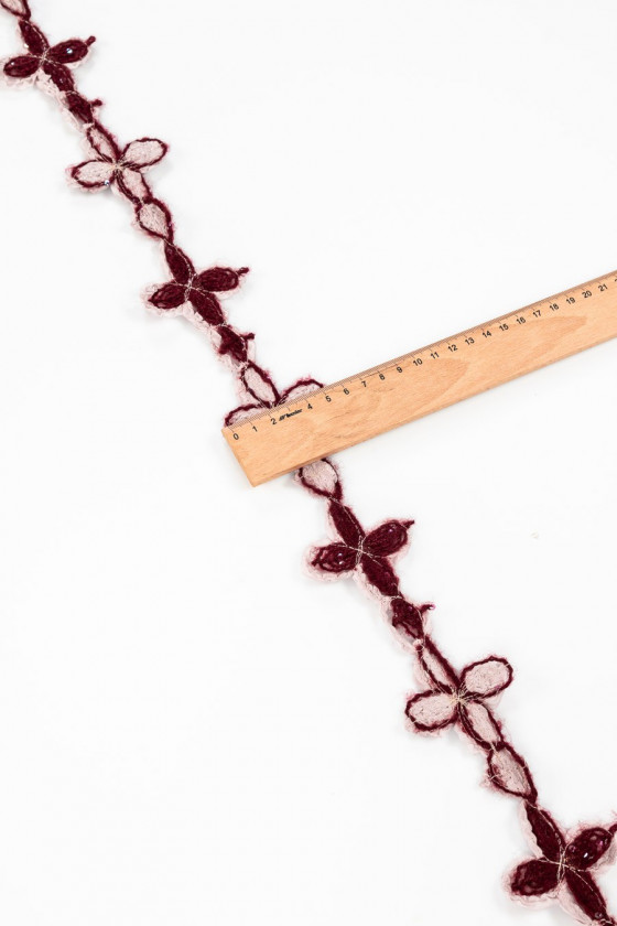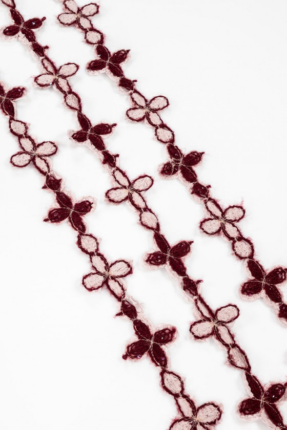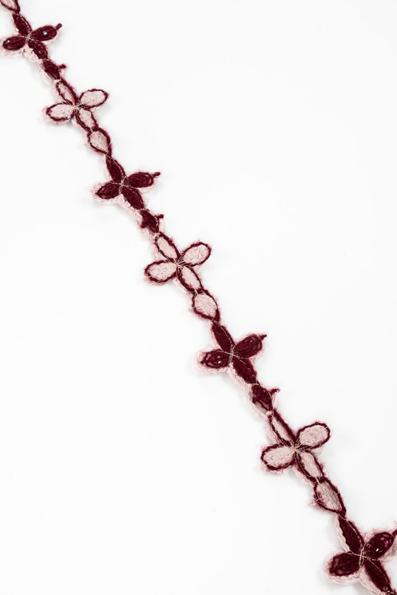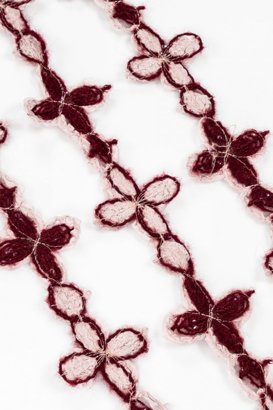 Haberdashery tape med bordeaux blomster i en lilla bufferzone med små pailletter syet på.