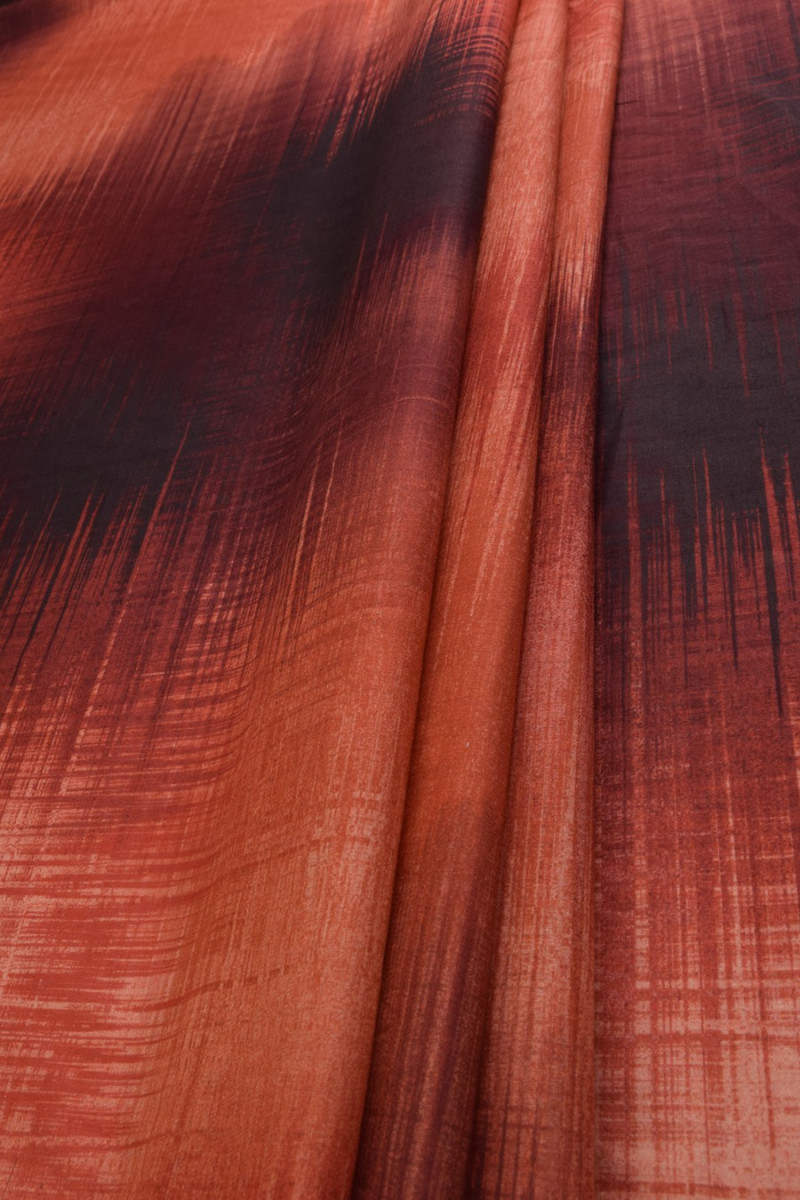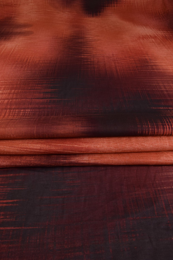 Bomuldsbatiste, i et abstrakt, skraveret mønster i rødbrune farver. Stoffet er 100/% naturligt, blødt og behageligt at røre ved. Vi anbefaler det til syning af sommer, luftigt tøj - kjoler, skjorter, bluser, pareoer.