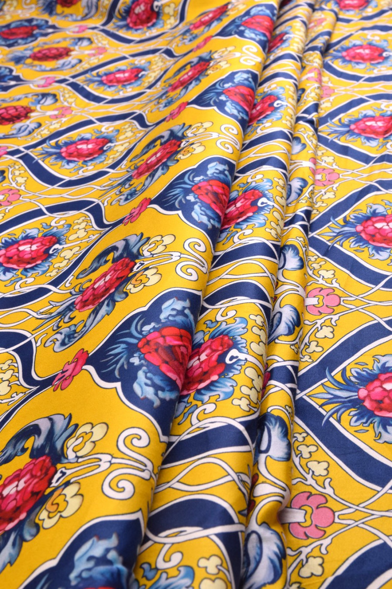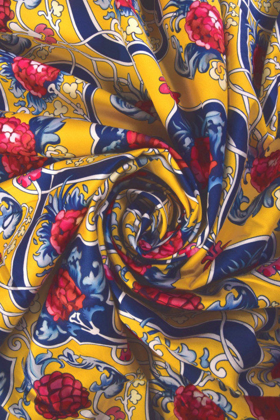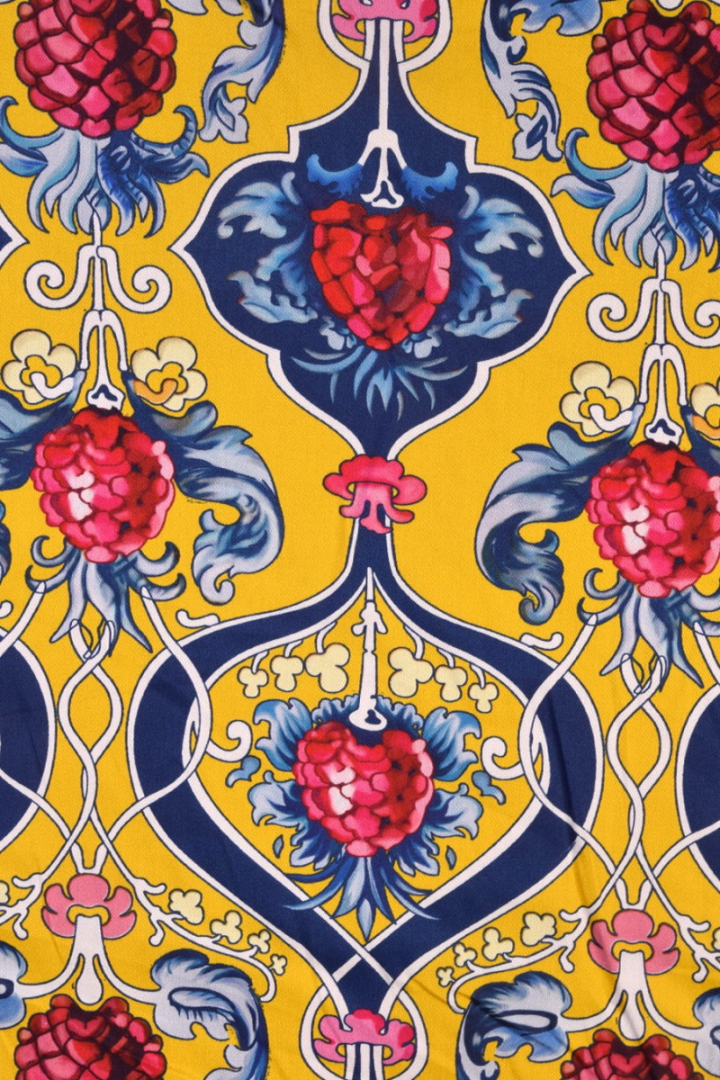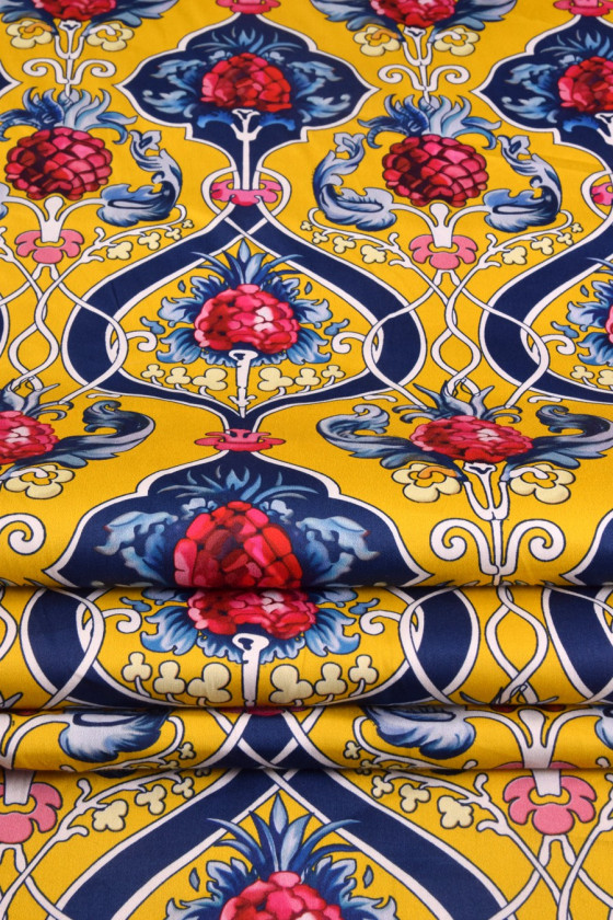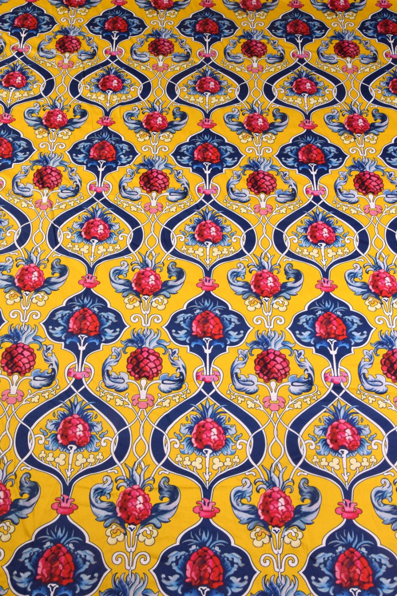 Bomuld trykt i et farverigt, dekorativt mønster med frugt ca. 10 cm i størrelse. Stoffet er 100% naturligt, stabilt. Et forslag til syning af sommerkjoler, nederdele, bukser. Det kan også være et interessant dekorativt stof. Farver: gul, rød, marineblå.