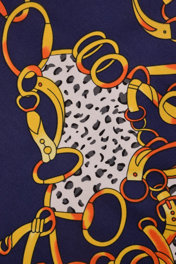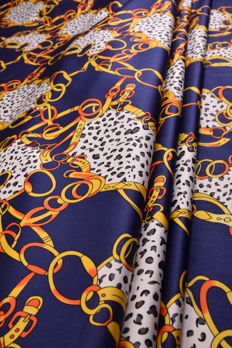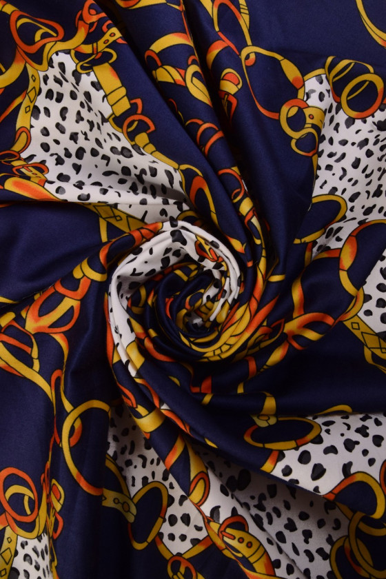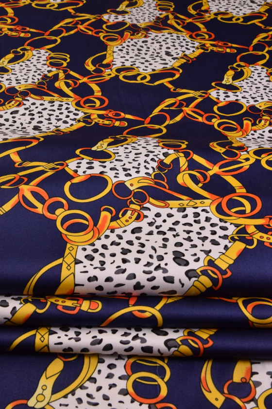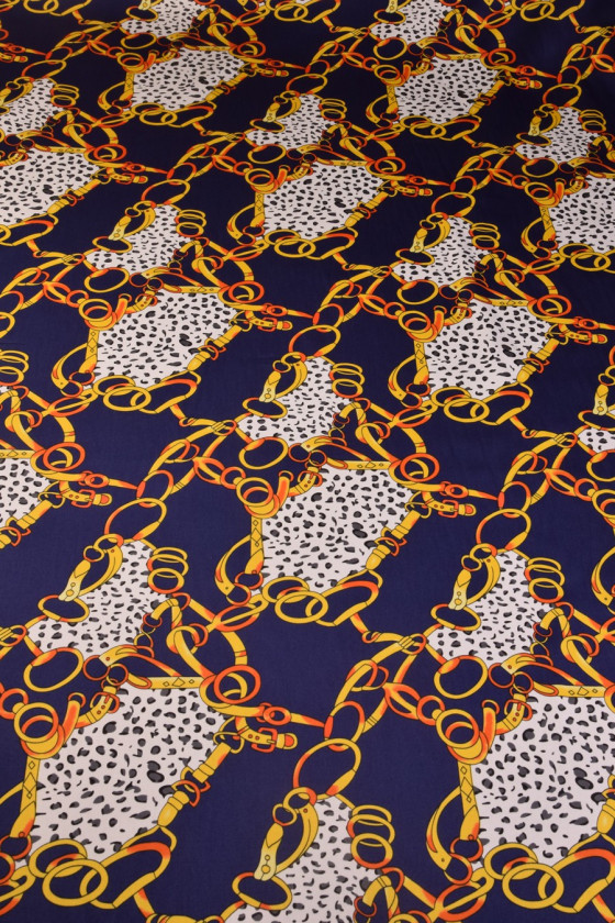 Elastisk bomuld med store, farverige kæder og striber. Stoffet er meget blødt og behageligt at røre ved. Vi anbefaler det til syning af bluser, skjorter, kjoler og nederdele. Farver: marineblå, hvid, gul
