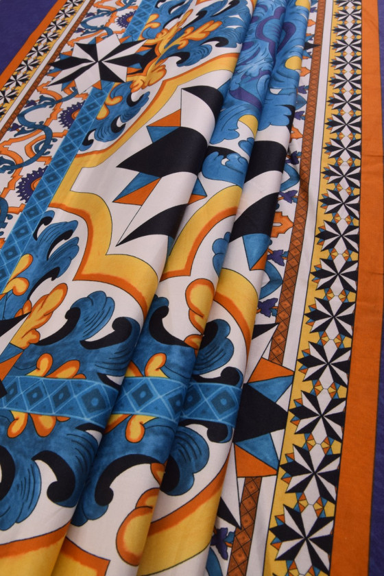 Italiensk bomuldsstof i kuponstørrelse 130cm*140cm. Et meget interessant, orientalsk mønster i sort, gul og blå.