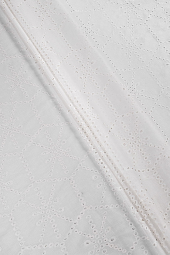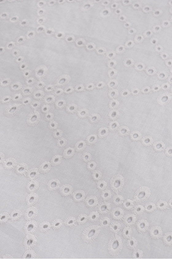 Italiensk 100% bomuldsstof med écru Richelieu broderi. Geometrisk motiv - terninger (16 cm) og kryds. Stoffet er tyndt, let gennemsigtigt, ikke elastisk.