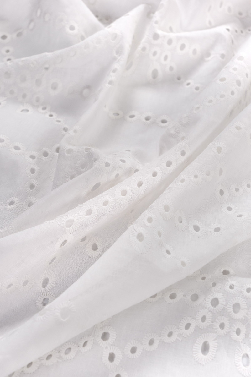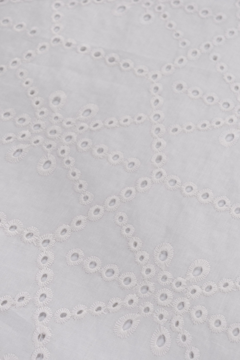 Italiensk 100% bomuldsstof med écru Richelieu-broderi. Geometrisk motiv - terninger (16 cm) og kryds. Tyndt, let gennemsigtigt, ikke-elastisk stof - perfekt til syning af en sommerkjole, bluse eller nederdel. Bomuld er en 100% naturlig fiber. Bomuldsstoffer er holdbare, slides ikke hurtigt, bevarer deres egenskaber i lang tid, er perfekt åndbare, åndbare, hvilket giver høj brugerkomfort.