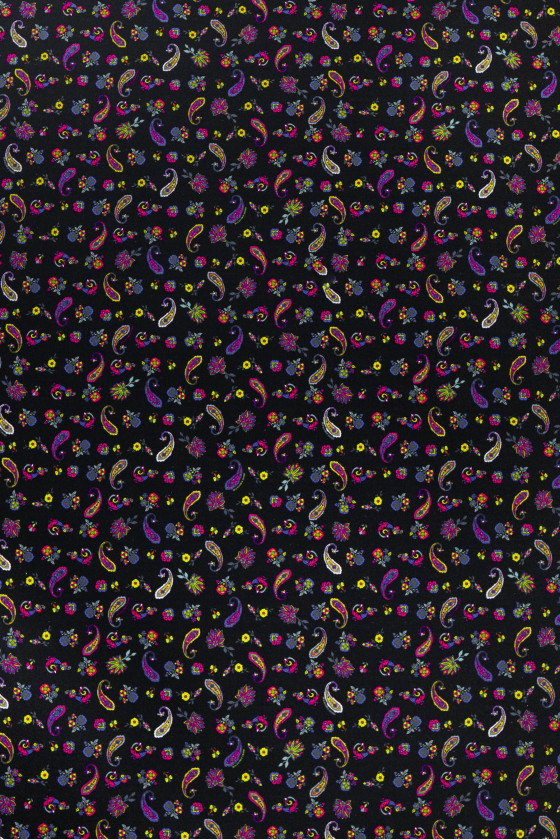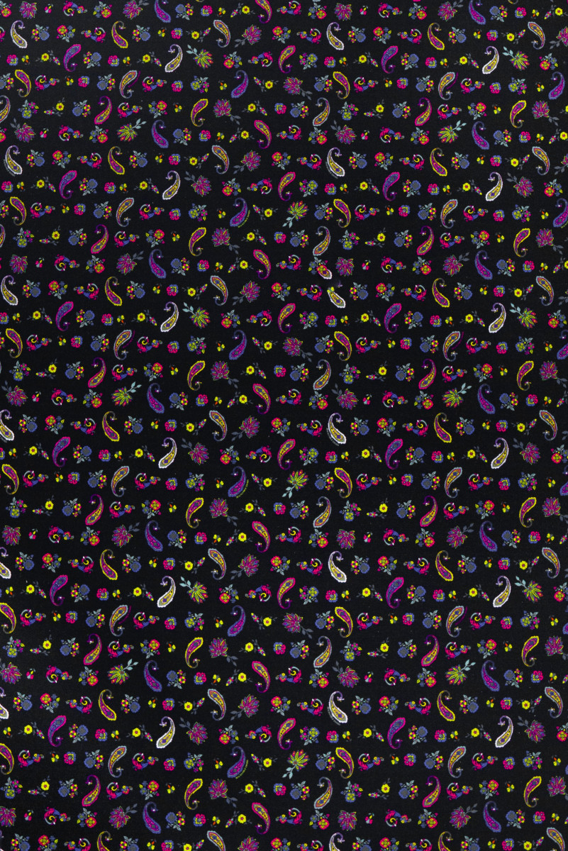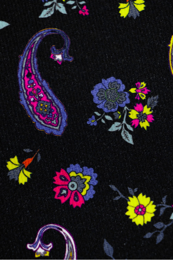 Italiensk bomuldsstof med twillvævning, der minder om denim. Et farverigt Paisley-motiv på sort baggrund, stof signeret med navnet på et velkendt modehus. Stoffet er tykkere, stift, let elastisk. Perfekt til syning af kjole, bukser, jakke.