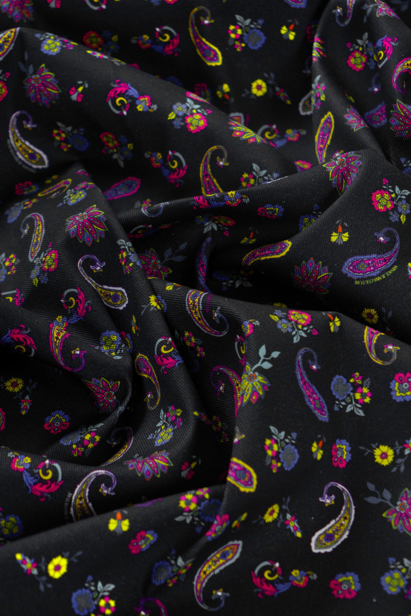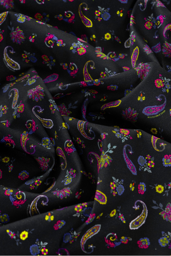 Italiensk bomuldsstof med twillvævning, der minder om denim. Et farverigt Paisley-motiv på sort baggrund, stof signeret med navnet på et velkendt modehus.
