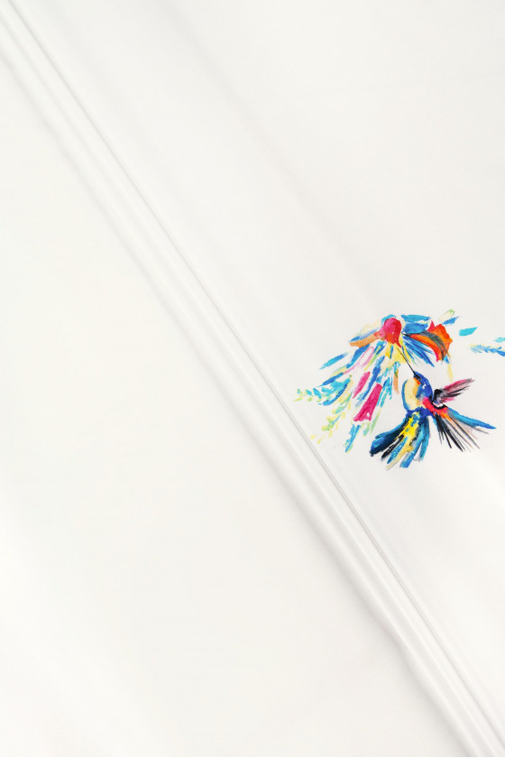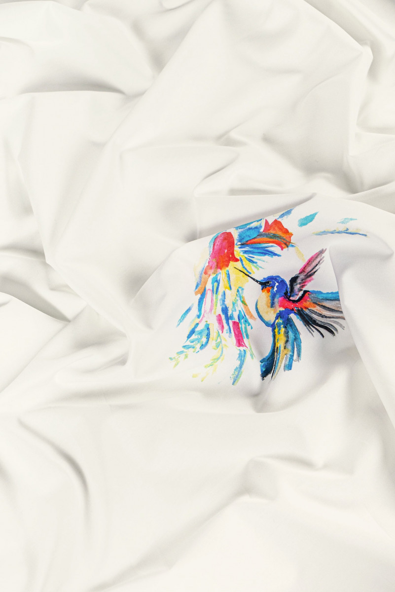 Italiensk skjortestof i 100% bomuld i kuponstørrelse 170cm*150cm. Cremefarvet stof med et fuglemotiv på 13 cm*22 cm, som er placeret i øverste højre hjørne af kuponen. Bomuld er en 100% naturlig fiber. Bomuldsstoffer er holdbare, slides ikke hurtigt, bevarer deres egenskaber i lang tid, er perfekt åndbare, åndbare, hvilket giver høj brugerkomfort. Ikke-elastisk, mat, let gennemsigtigt stof - perfekt til syning af kjole, bluse eller skjorte.