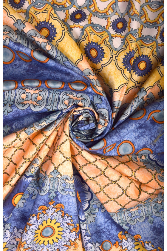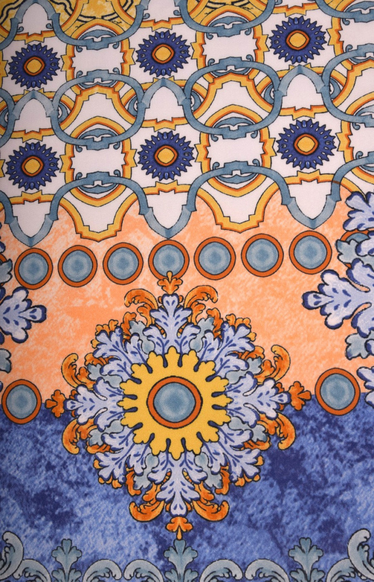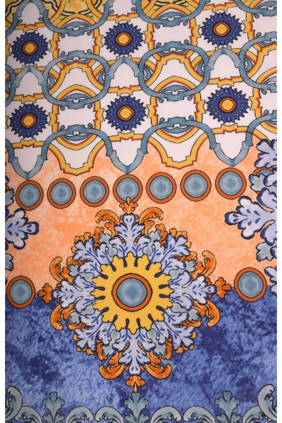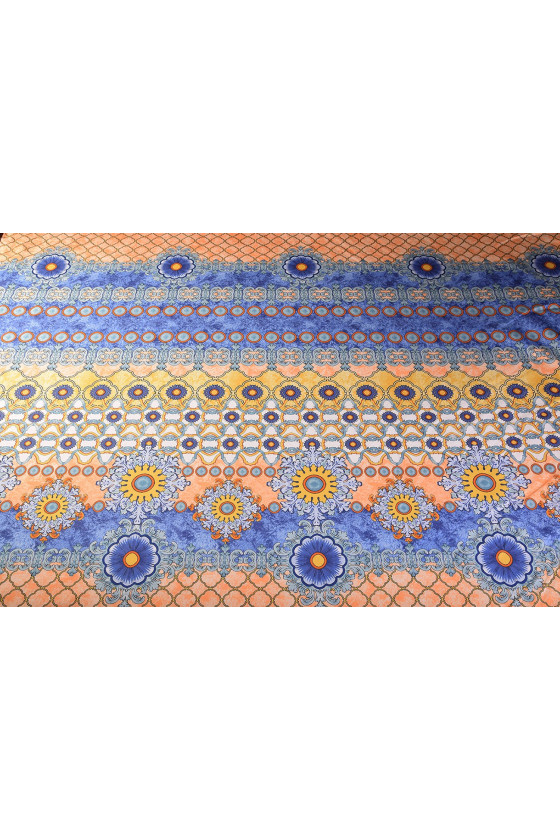 Farverig mønstret bomuld, Perfekt til sommerkjoler, tunikaer, bluser. Stoffet kommer i kupon 100 cm* 140 cm.