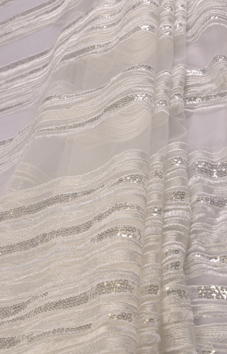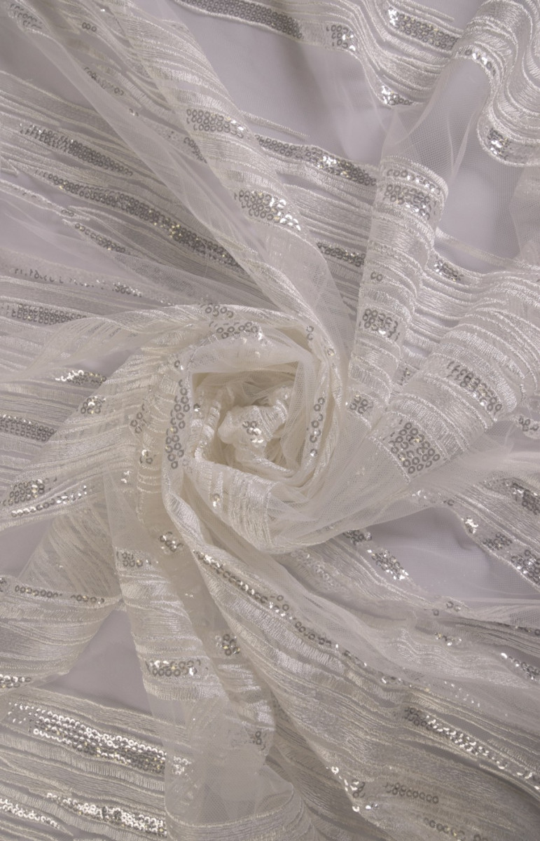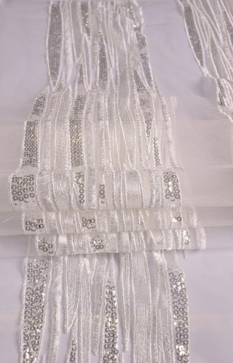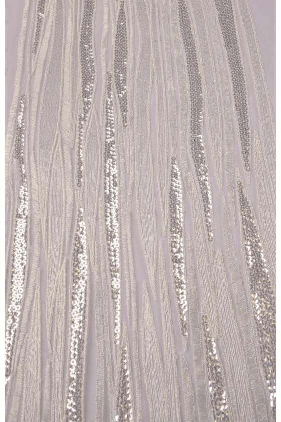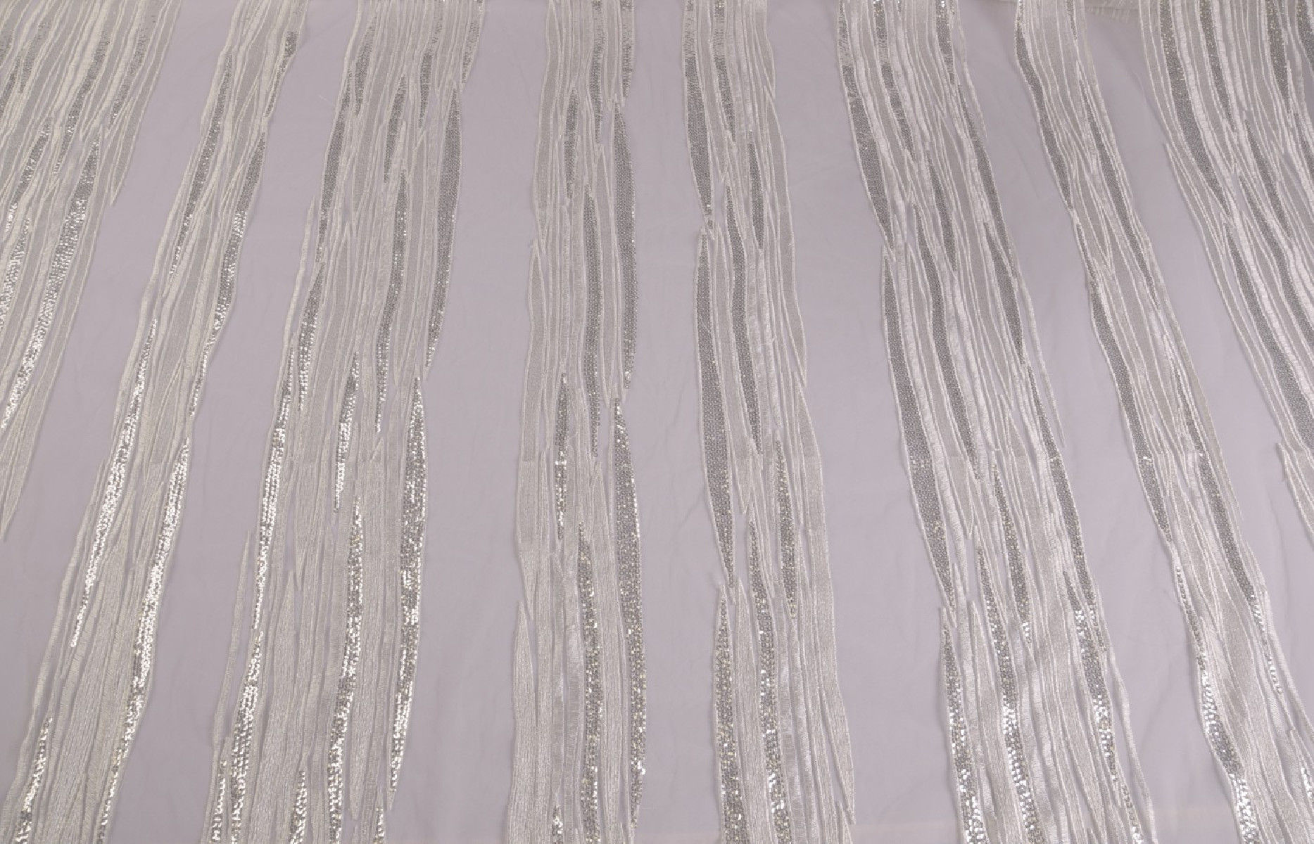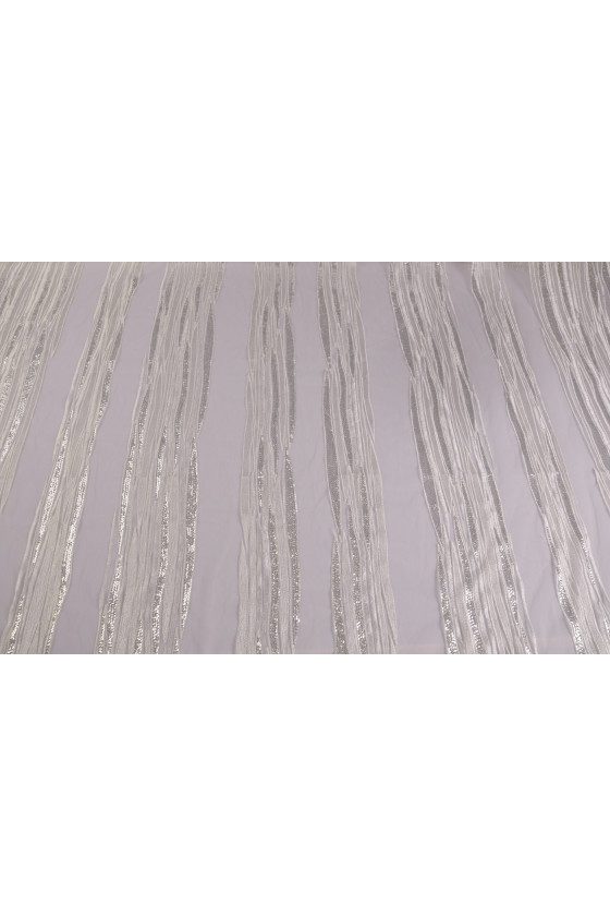 Bryllupsblonder broderet i et originalt mønster af store striber (fra 10-22 cm), hvortil sølvpailletter sys, takket være, at stoffet skinner diskret. Strukturen er moderat stiv. Farve – hvid creme