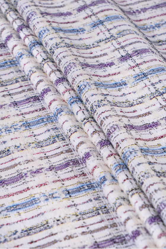 Eksklusivt chanel stof til syning af originale jakker eller tynde frakker. Farver: Flerfarvede tråde er uregelmæssigt viklet ind på den hvide kæde. Stoffet er vævet af mange garner.