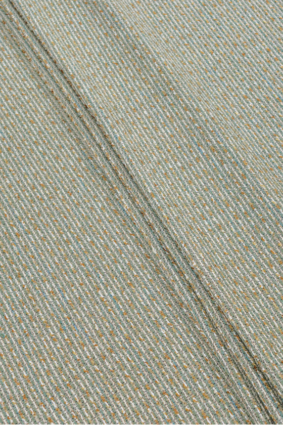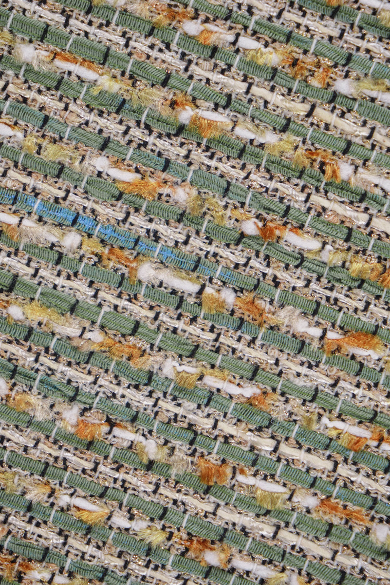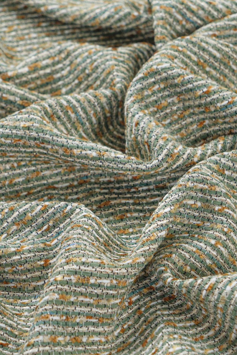 Italiensk chanel kostume stof i beige og oliven med skinnende lurex tråd. Et blødt, kødfuldt stof med en tæt vævning - perfekt til syning af kostume, kjole, nederdel, shorts eller en tynd frakke.