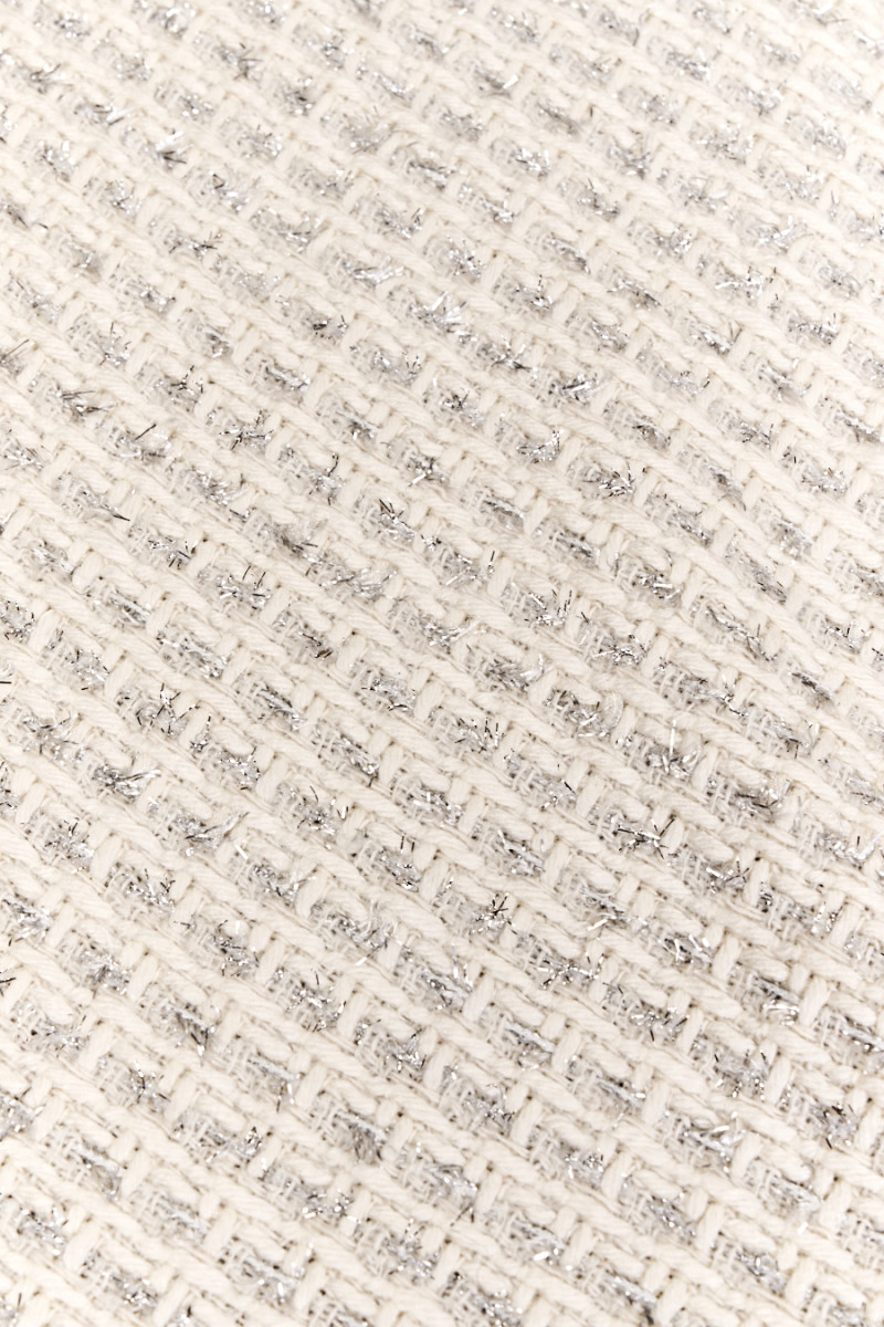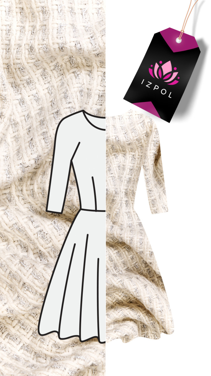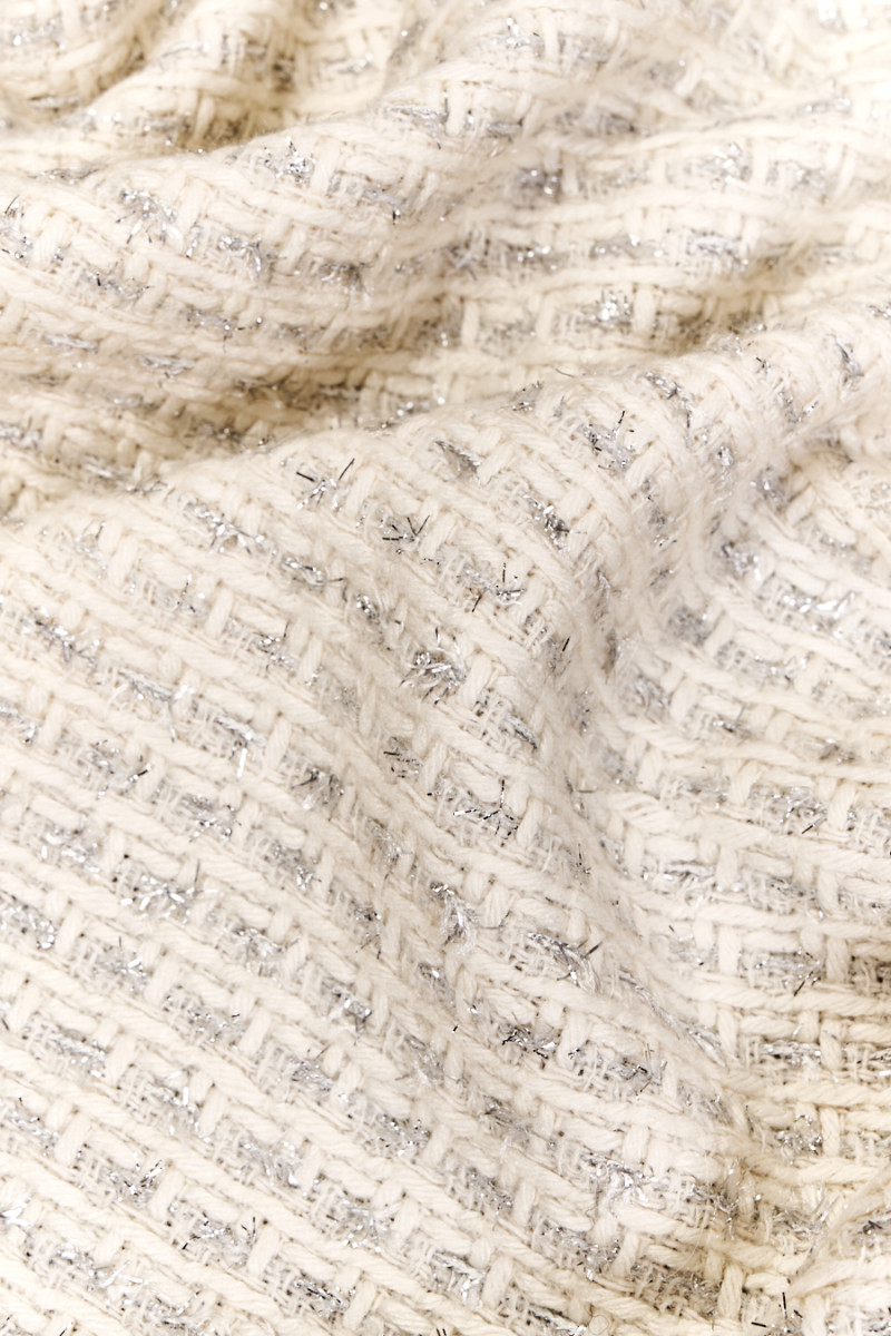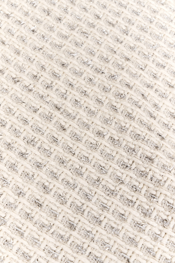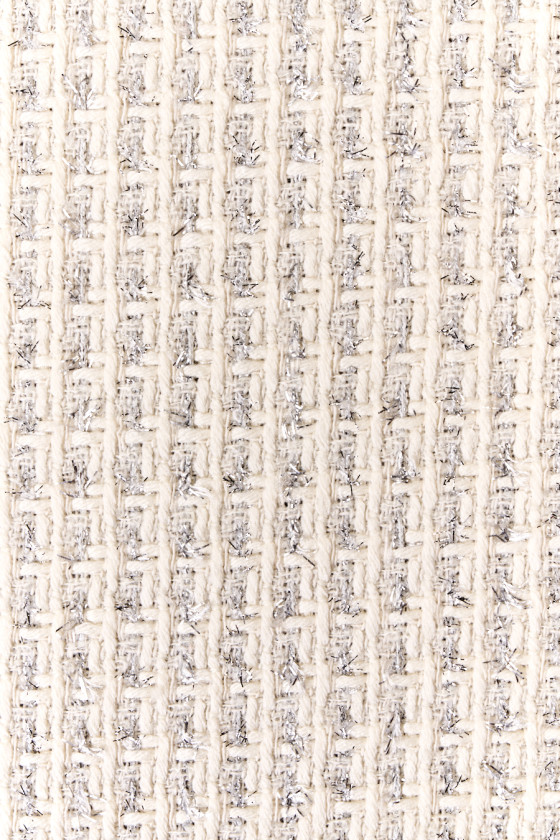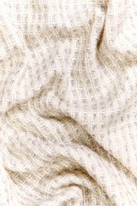 Cremefarvet italiensk chanel kostume stof med lysegrå, vandret sammenfletning dekoreret med sølv, skinnende tråd, som tilføjer elegance til det. Trådene danner et mønster af en fin, delikat tern. Stoffet er hovedsageligt lavet af naturlige fibre, derfor er det meget behageligt at have på, blødt og ikke-elastisk. Et fantastisk tilbud til fans af tweedtøj i lyse, pastelfarver.
