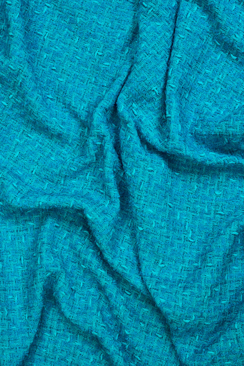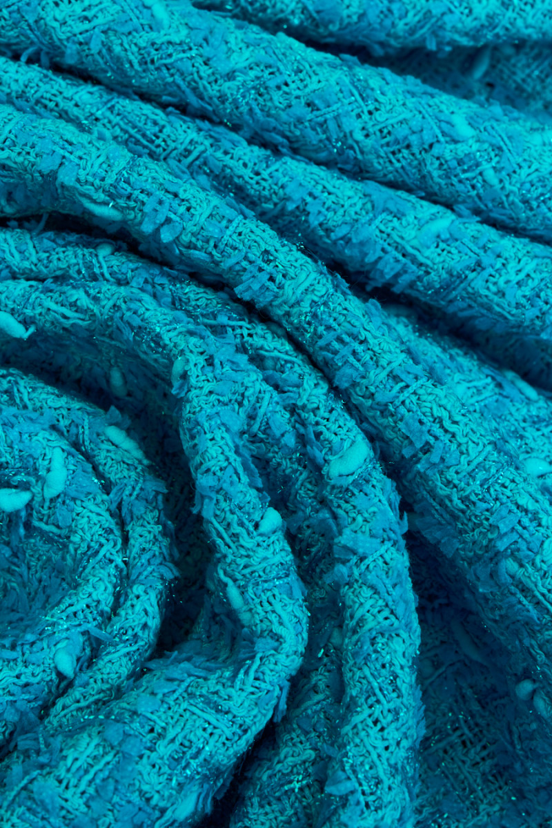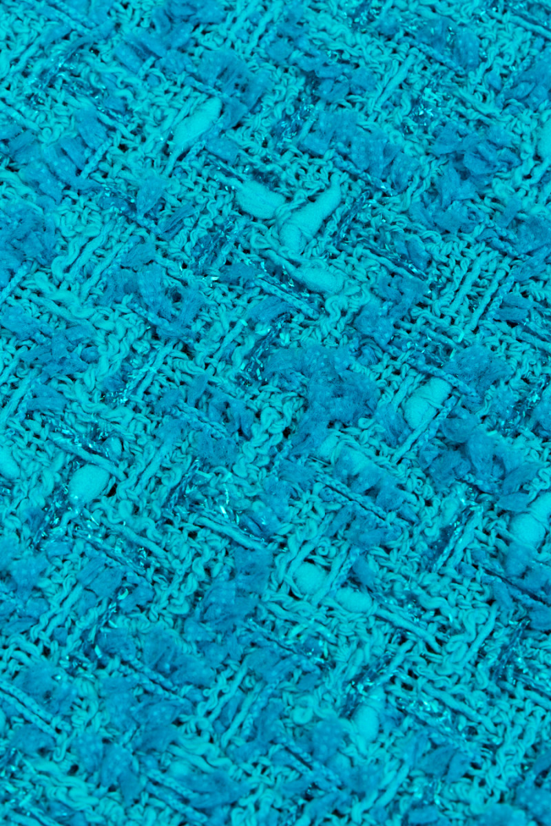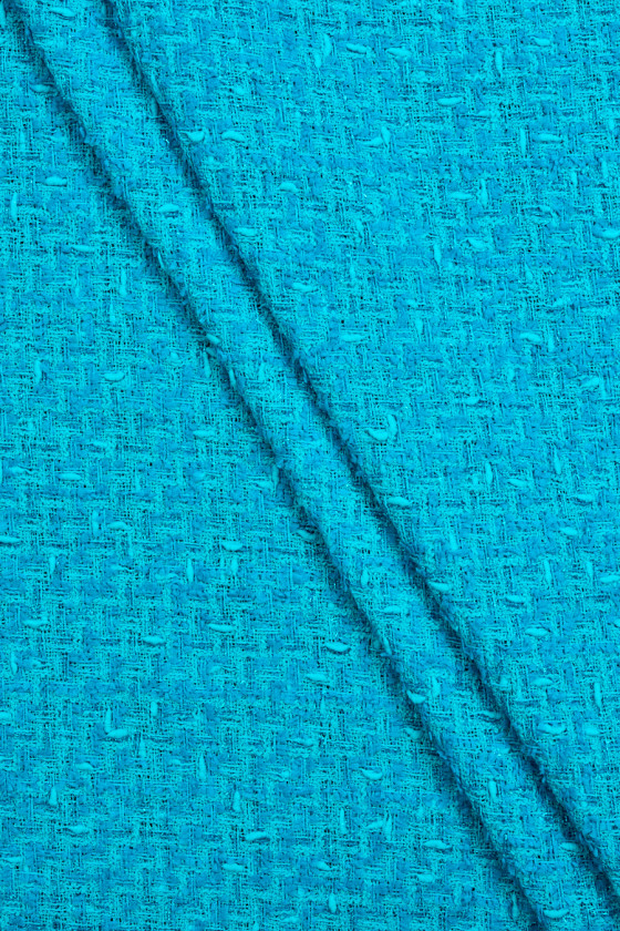 Italiensk chanel kostume stof i turkis dekoreret med en skinnende tråd i samme farve. Stof med en let konveks struktur og en løsere vævning, blød, ikke-elastisk. Det er perfekt til syning af både elegant og hverdagstøj. Et godt forslag i en energisk farve vil være perfekt til syning af et kostume, kjole eller nederdel.
