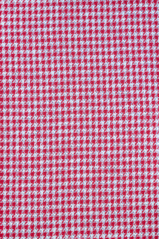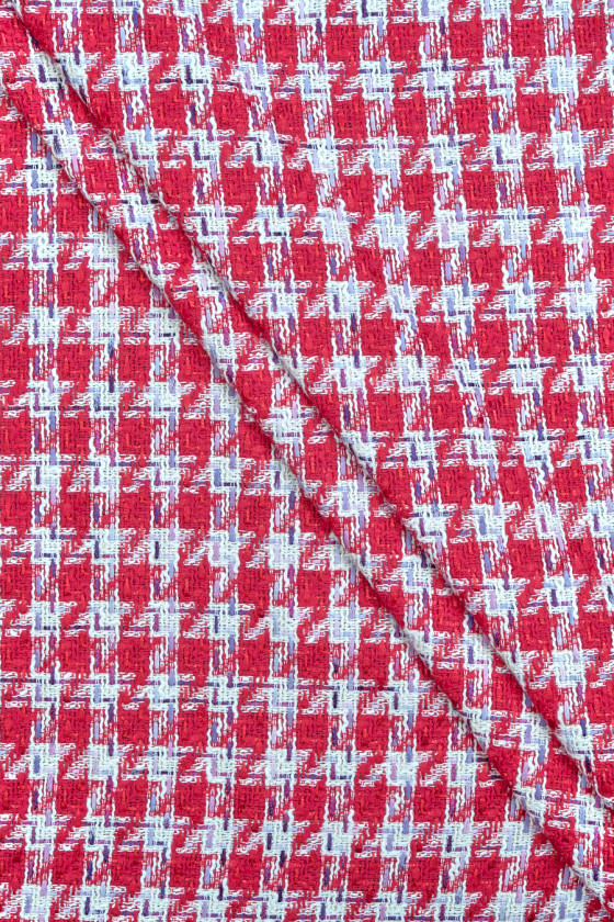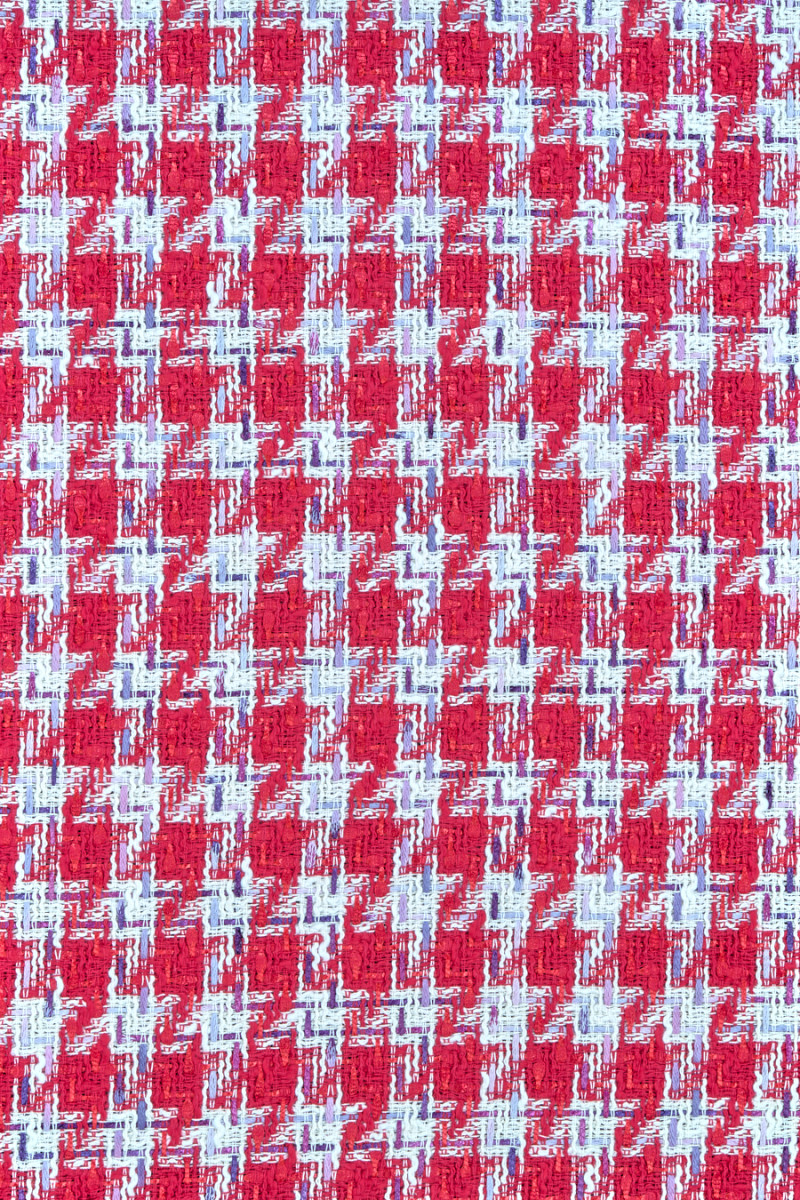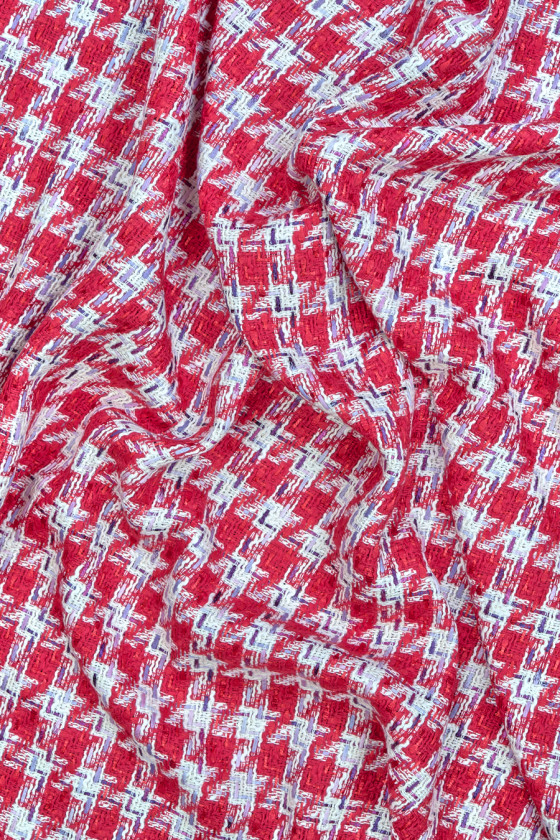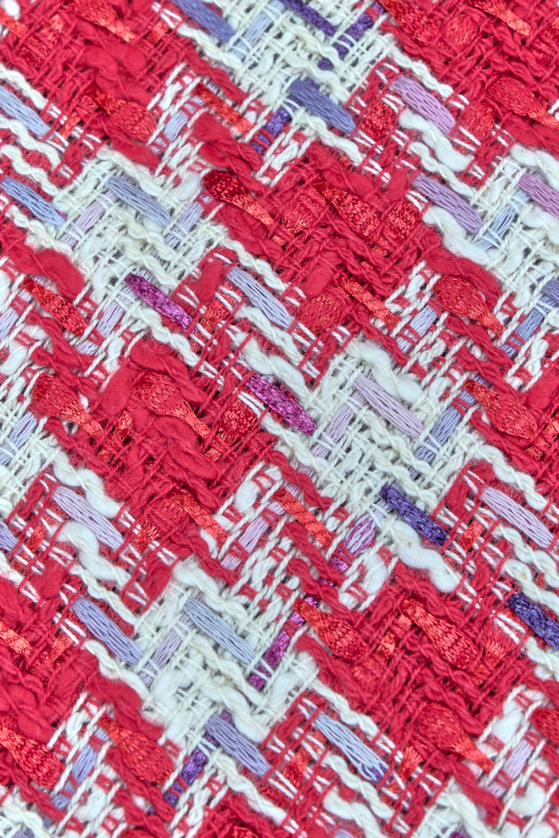 Italiensk chanel kostume stof i lys rød og creme, dekoreret med glitrende tråd i fuchsia og lilla. Stoffet er blødt, behageligt at røre ved, hovedsageligt lavet af naturlige fibre, derfor er det meget behageligt at have på, kendt for sin originale vævning. Det er perfekt til syning af et kostume, kjole og tynd frakke.