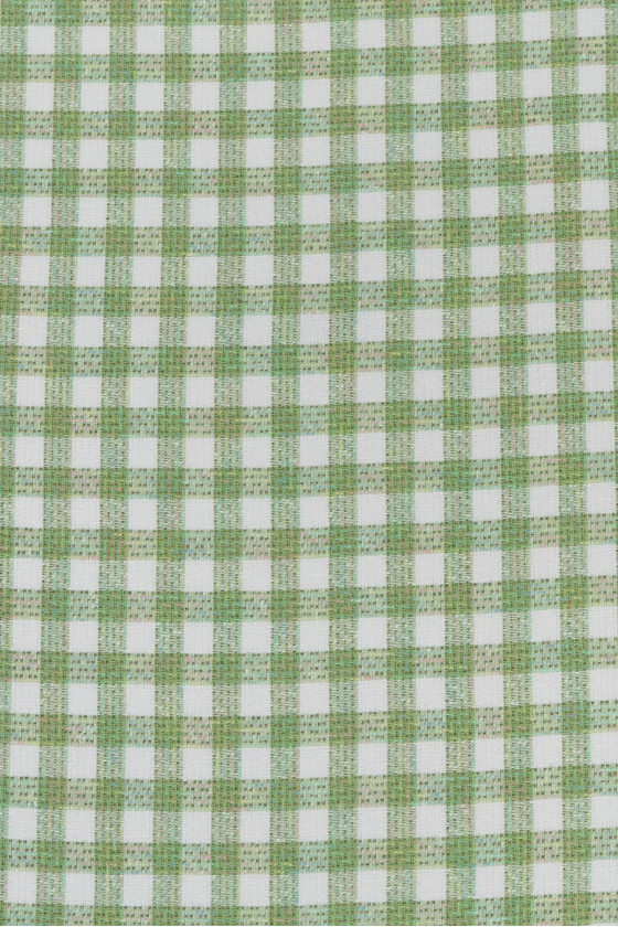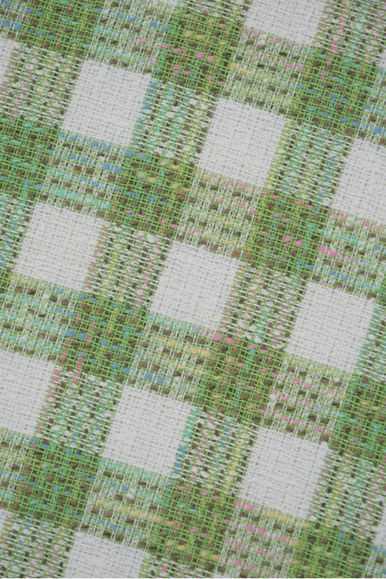 Ternet chanel kostume stof i hvid og lysegrøn med en lyserød og blå accent, beregnet til tynde nederdele eller kjoler. Materialet er løst vævet af 100% viskose, hvorfor det er åndbart og åndbart.