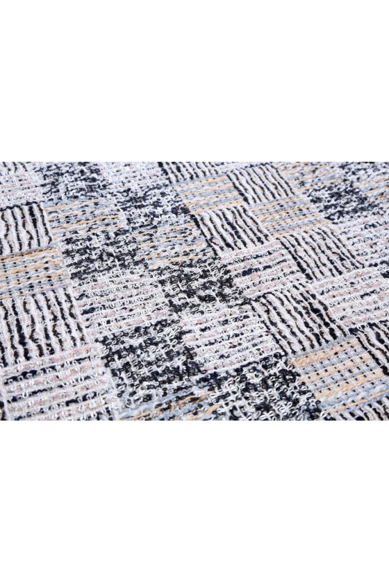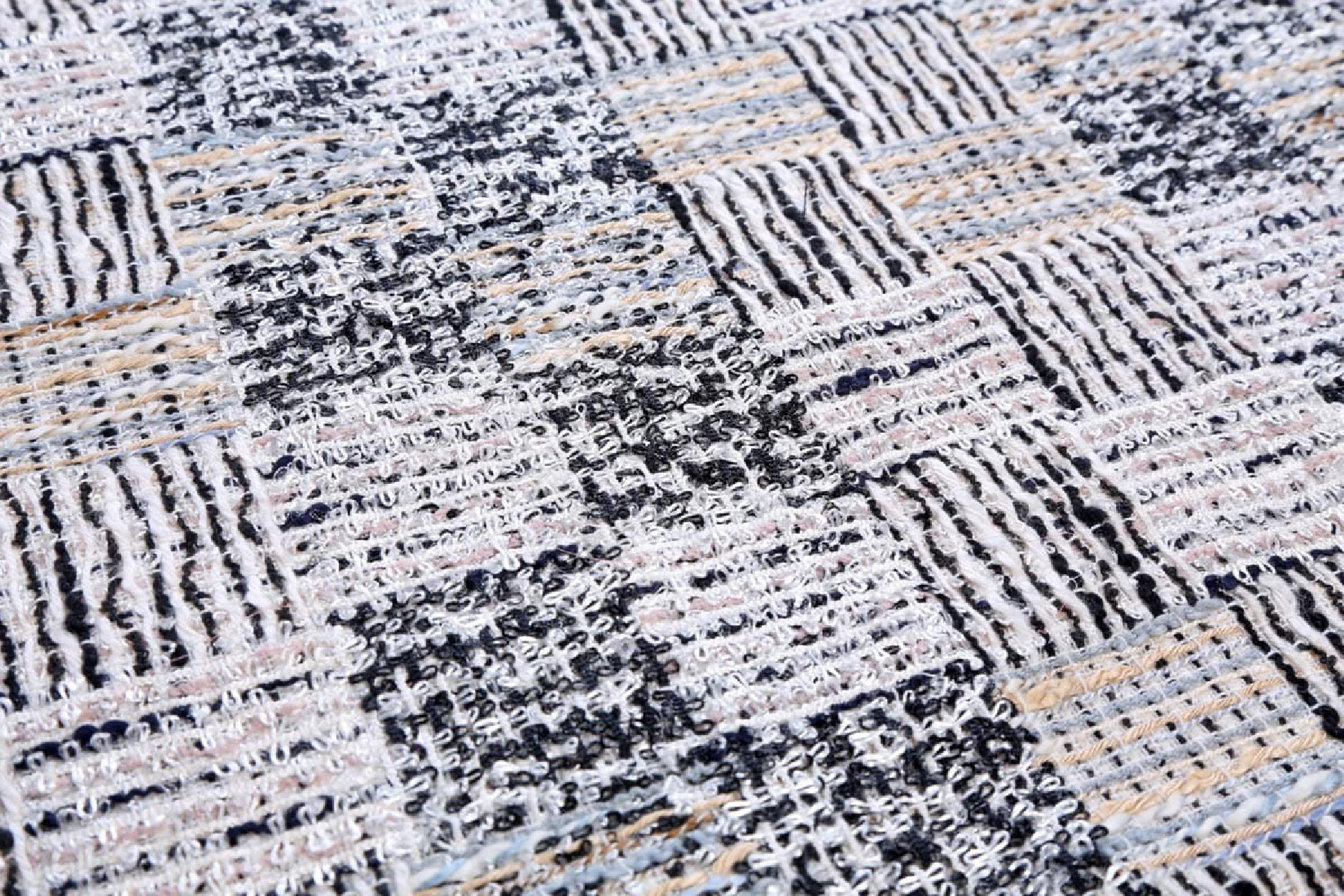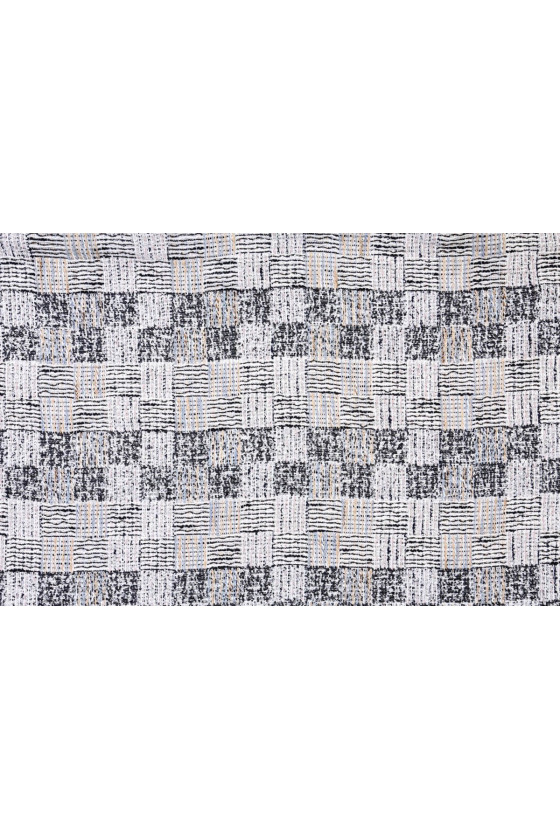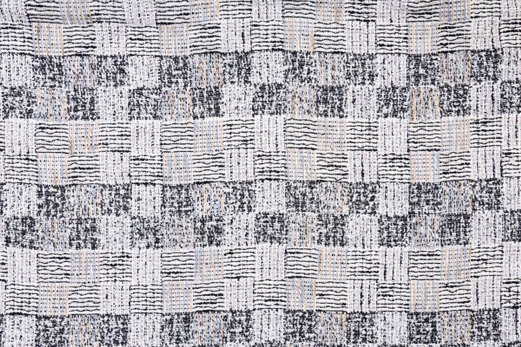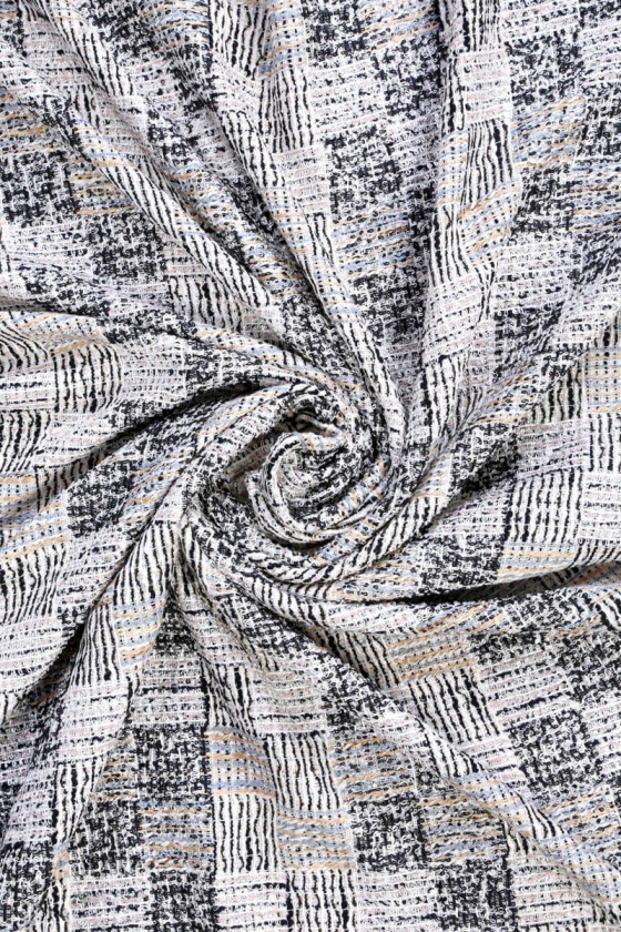 Original chanel kostume stof med hvid, sort og beige kontrollerer elegante sæt - jakker med nederdele og kjoler. Stoffet er vævet af viskose med tilsætning af uld, som sikrer komfort i at bære, og polyesterfiberen giver stoffet holdbarhed. Vi anbefaler at vælge en foring, som du kan finde i vores butik. Materialet er ikke elastisk.