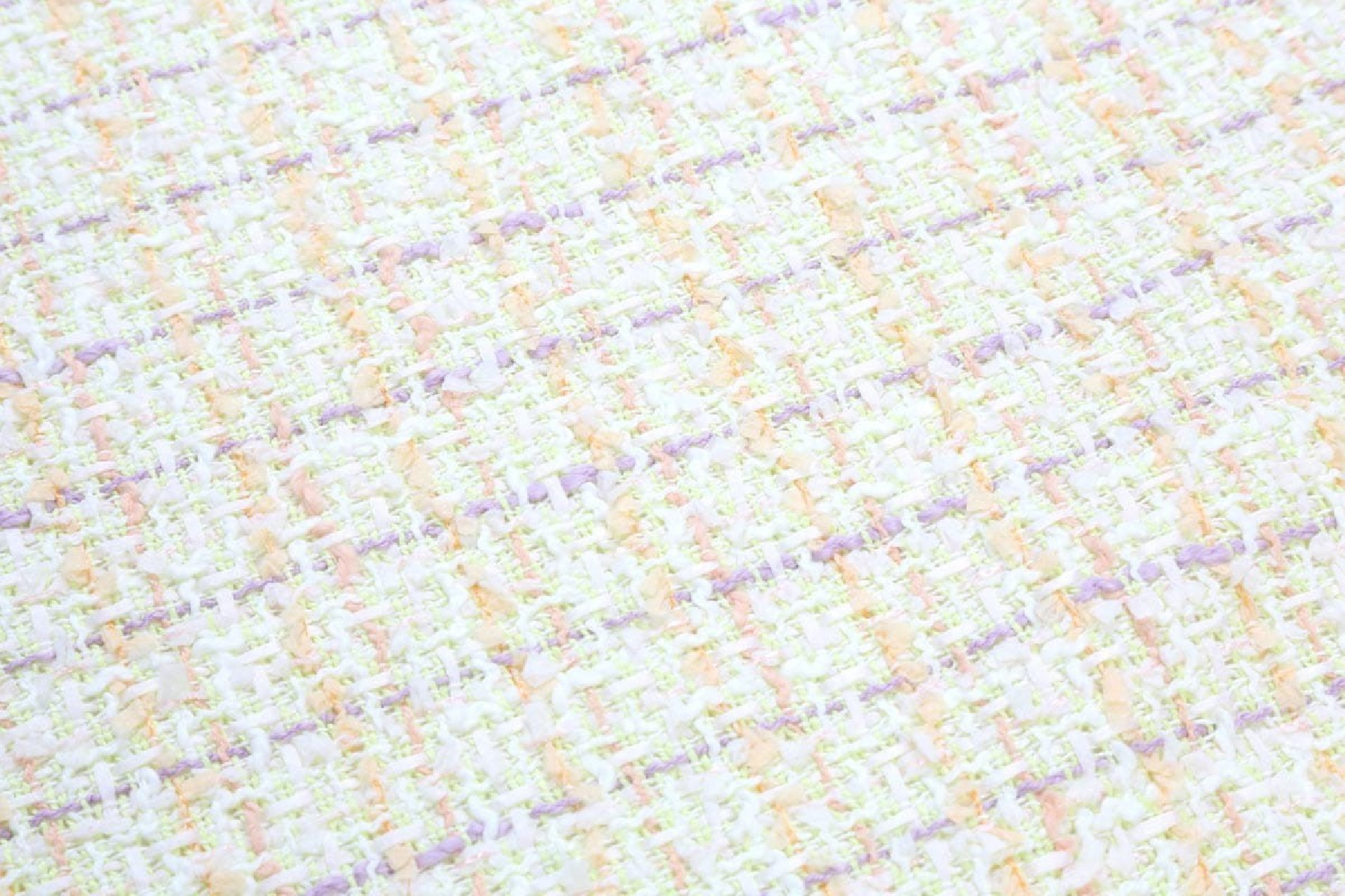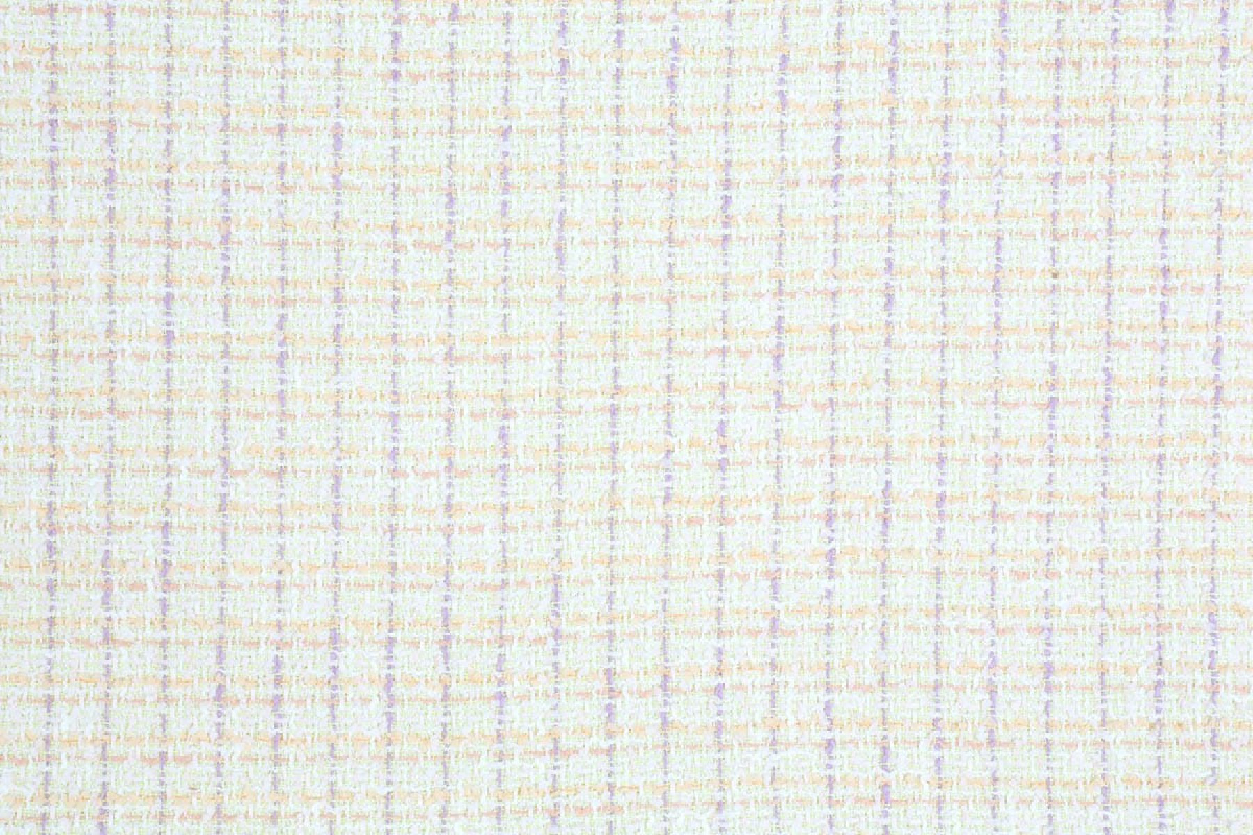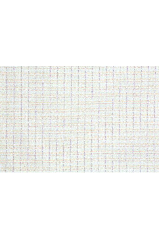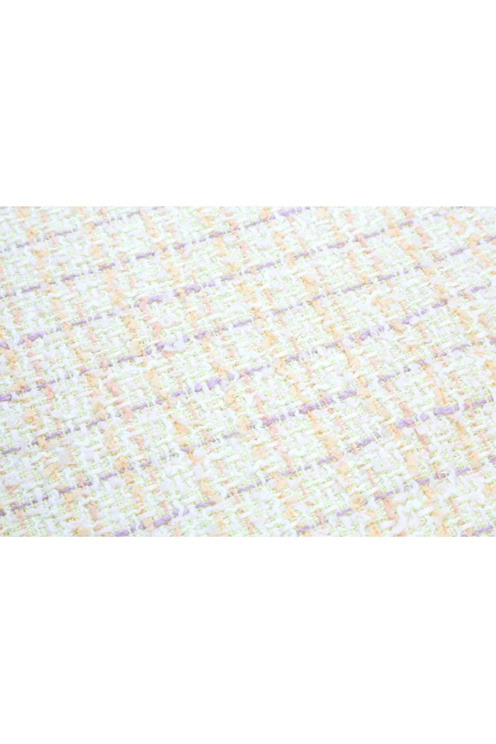 Chanel kostume stof i pastelfarver af orange, lilla og hvid til kostumer, nederdele eller kjoler. Stoffet er stabilt og kræver foring.