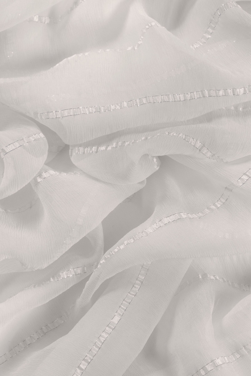 Naturlig silkechiffon krøllet med lurex er et meget delikat, luftigt og gennemsigtigt stof. Perfekt til elegante luftige kjoler og bluser. Elastisk stof - arbejder på tråde. Farver: ecru, hver 7 cm en diskret stribe med sølv lurex tråd.