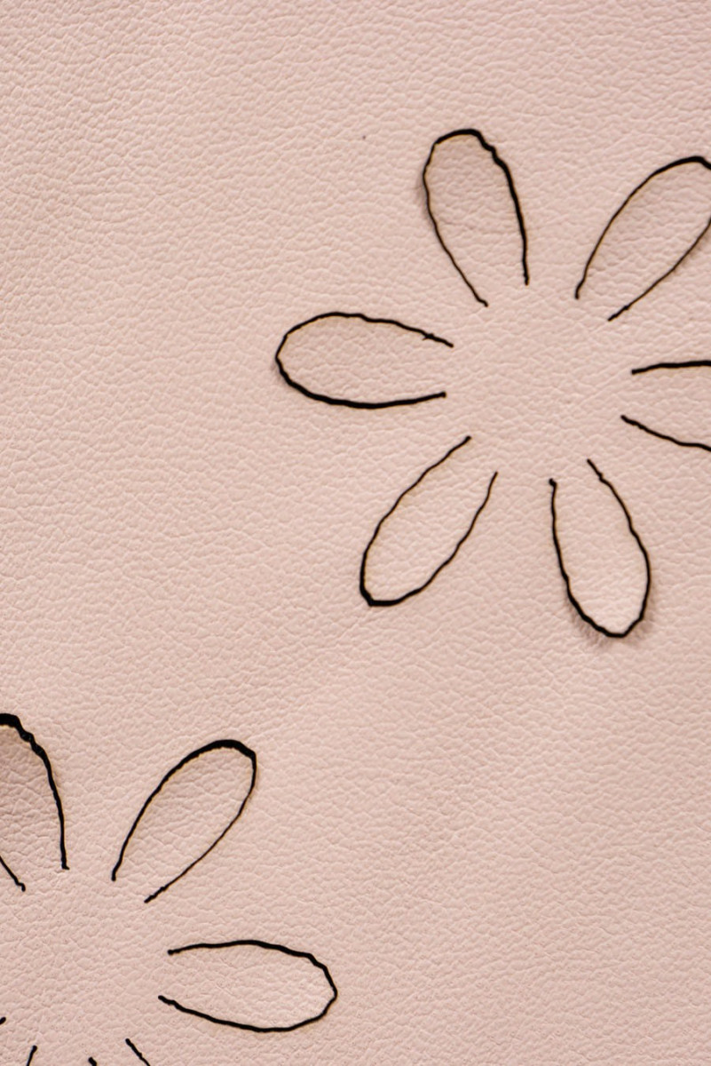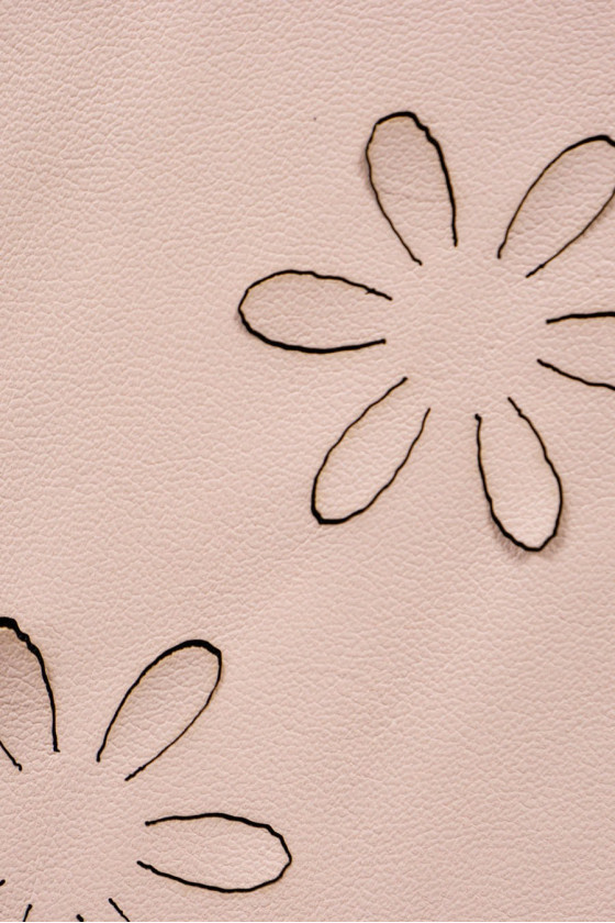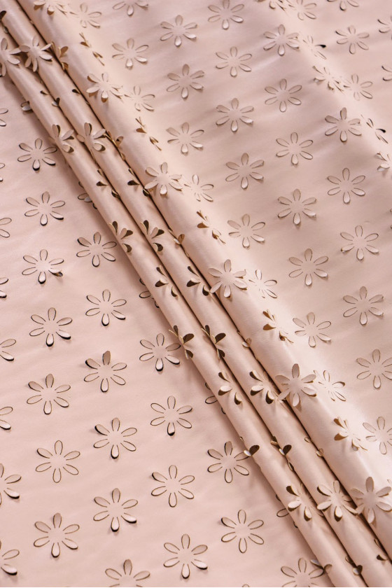Meget god kvalitet øko læder i lys, varm beige farve med en dråbe pink med laserskårne blomster. Stoffet er lavet af syntetiske fibre, elastisk, vildledende ligner naturligt læder. Vi anbefaler det til syning af monteret tøj - nederdele, bukser osv.