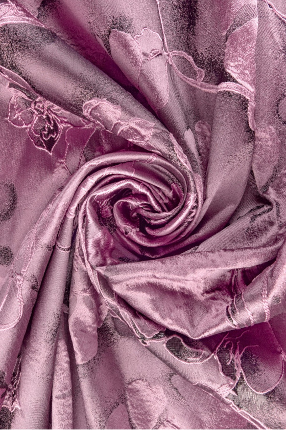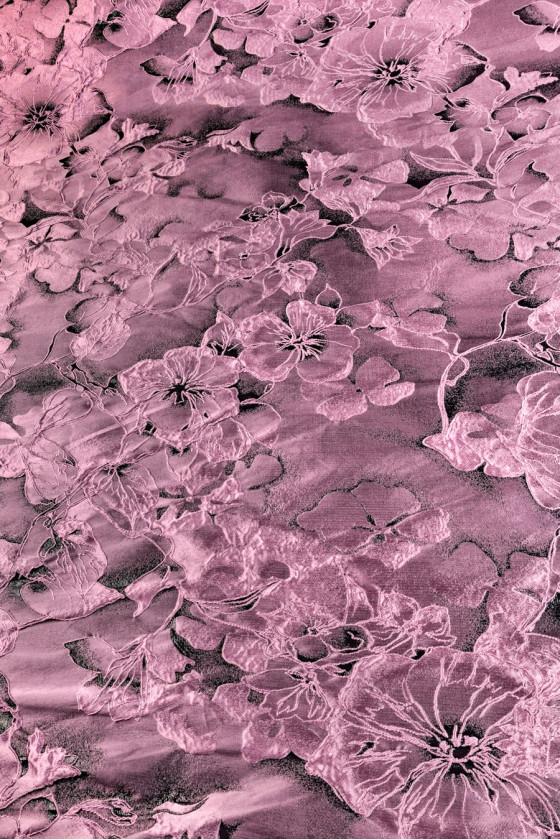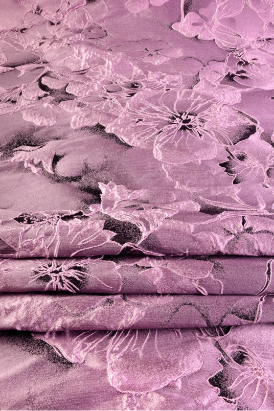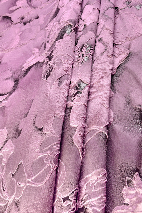 Eksklusiv jacquard i antik pink/lyng med lurex tråd, vævet i et mønster af store prægede 3D blomster. Stoffet er ret stift og ligner taft i struktur. Et smukt forslag til en formel kjole, nederdel, jakke, tynd frakke. Tør venligst op!