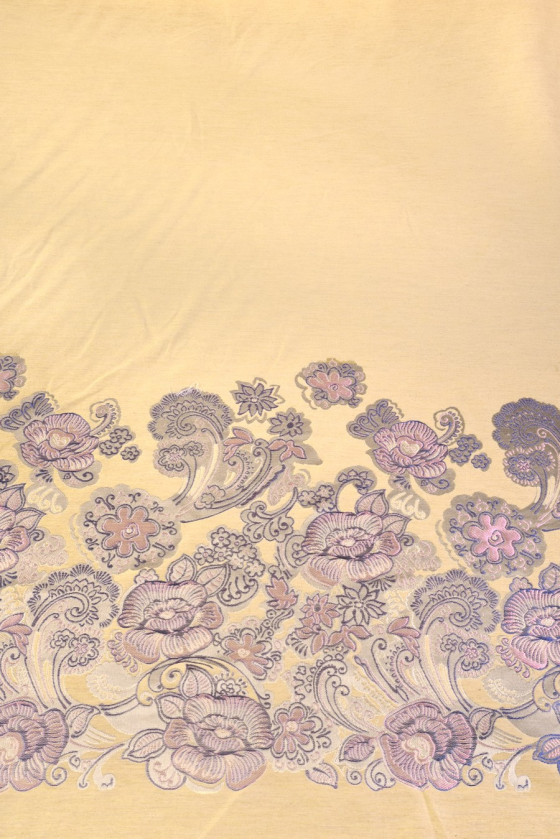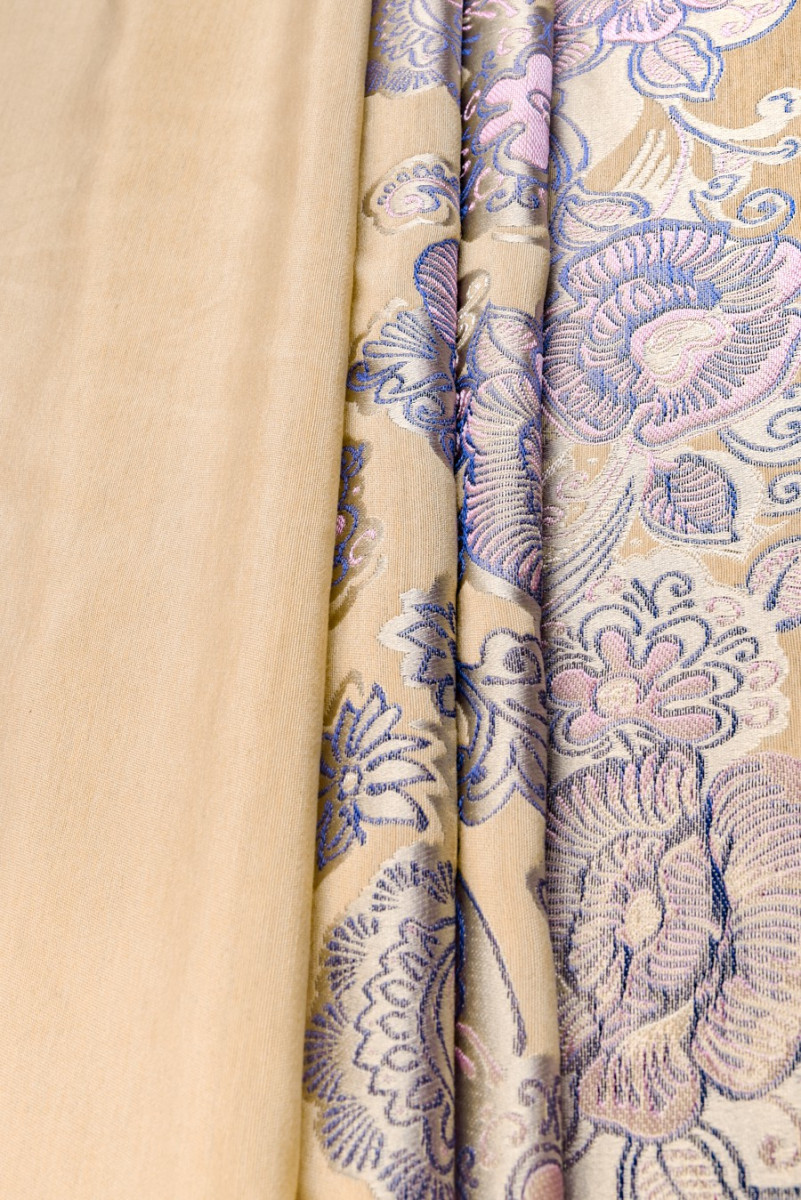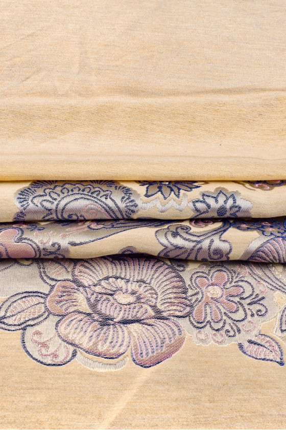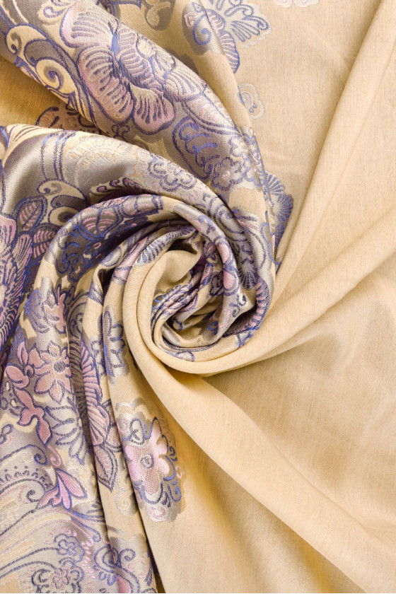 Jacquard i gylden beige, med lilla-lyserøde blomster i bunden. Stof beregnet til kjoler, frakker, nederdele. Stoffet kommer i kuponer på 120cm*150cm.