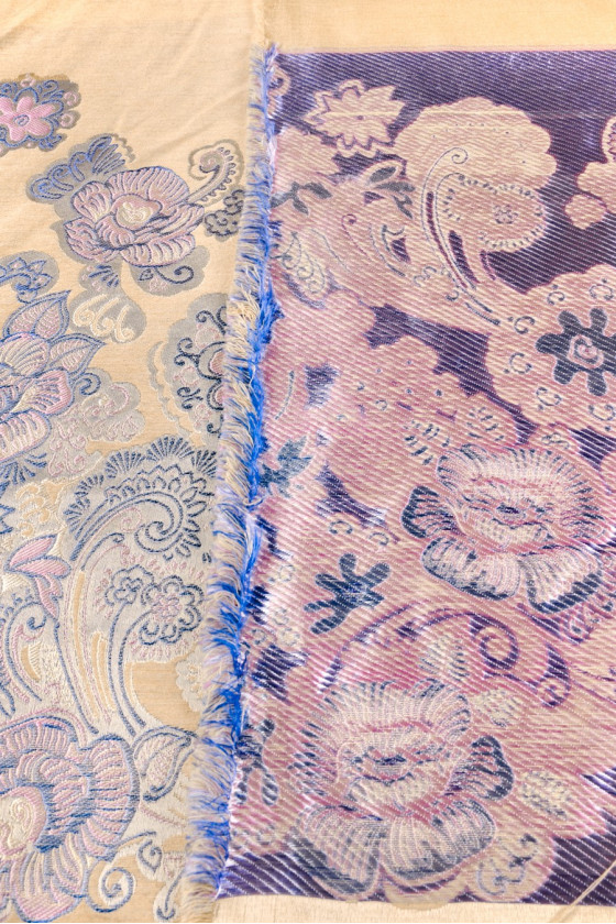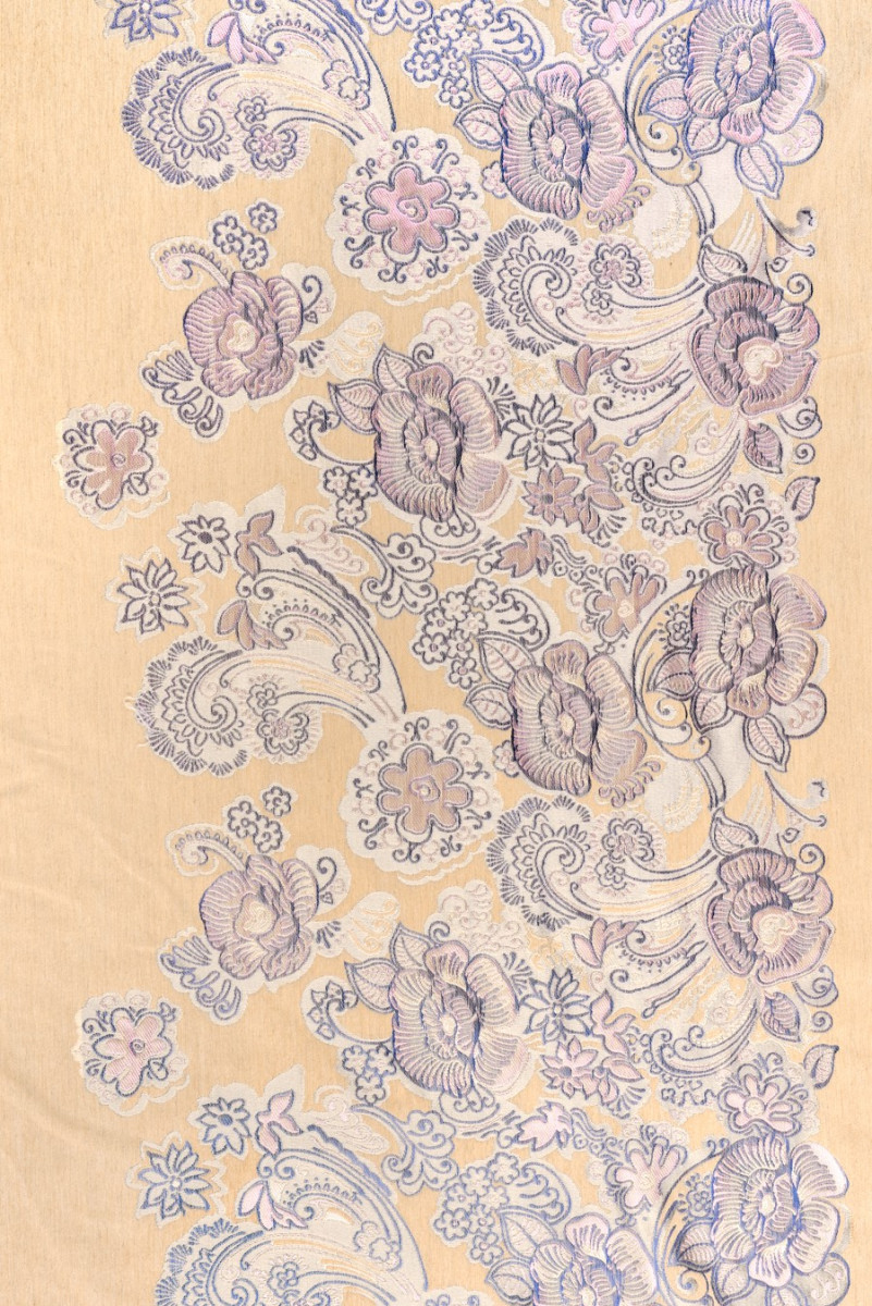 Italiensk jacquard kostume stof i en kuponstørrelse 120cm*150cm. Baggrunden for materialet er lavet i varm beige med et blomstermotiv ca. 40 cm højt. Mønsteret er placeret i bunden af kuponen, og det har en kornblomstblå kant med gråt og lilla-lyserødt fyld. Stoffet er medium tykt, mat og ikke-elastisk. Et meget interessant forslag til syning af en kjole, jakke eller tynd frakke.