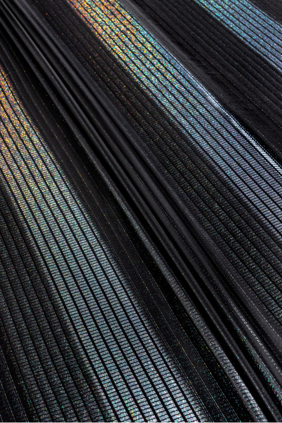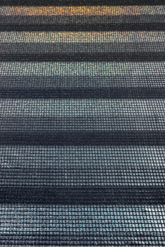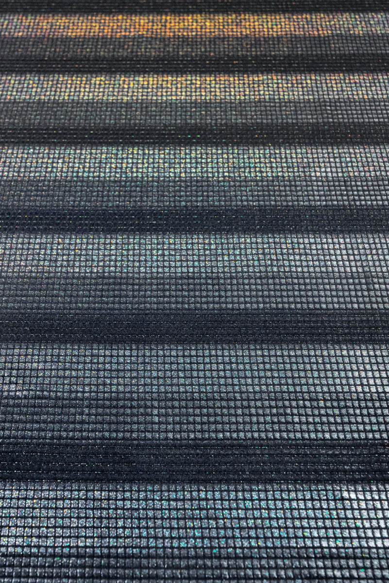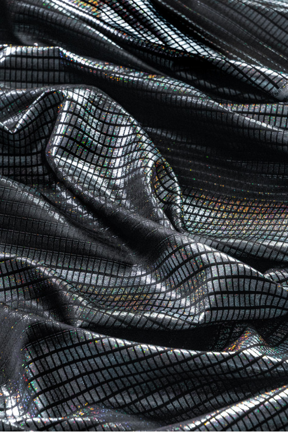 Italiensk jacquardkostumestof i sort med et skyggefuldt ternet motiv, der skaber lodrette striber. Stoffet er tyndt, men uigennemsigtigt, blødt, smukt dekoreret med lurextråd i flerfarvet.