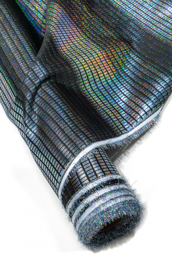 Italiensk jacquardkostumestof i sort med et skraveret ternet motiv, der skaber lodrette striber. Stoffet er tyndt, men uigennemsigtigt, blødt, smukt dekoreret med lurextråd i flerfarvet. Perfekt til syning af en aftenkjole, bluse eller kostume.