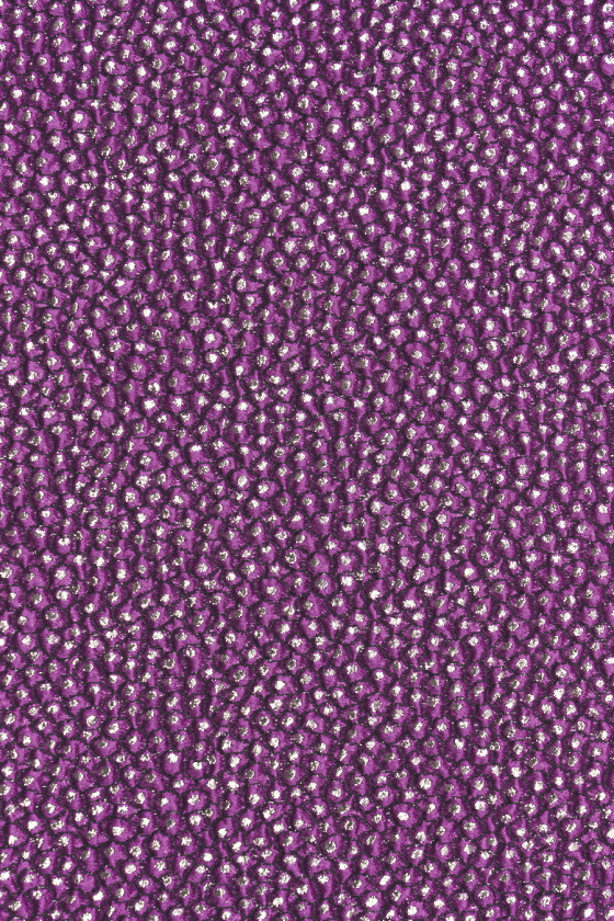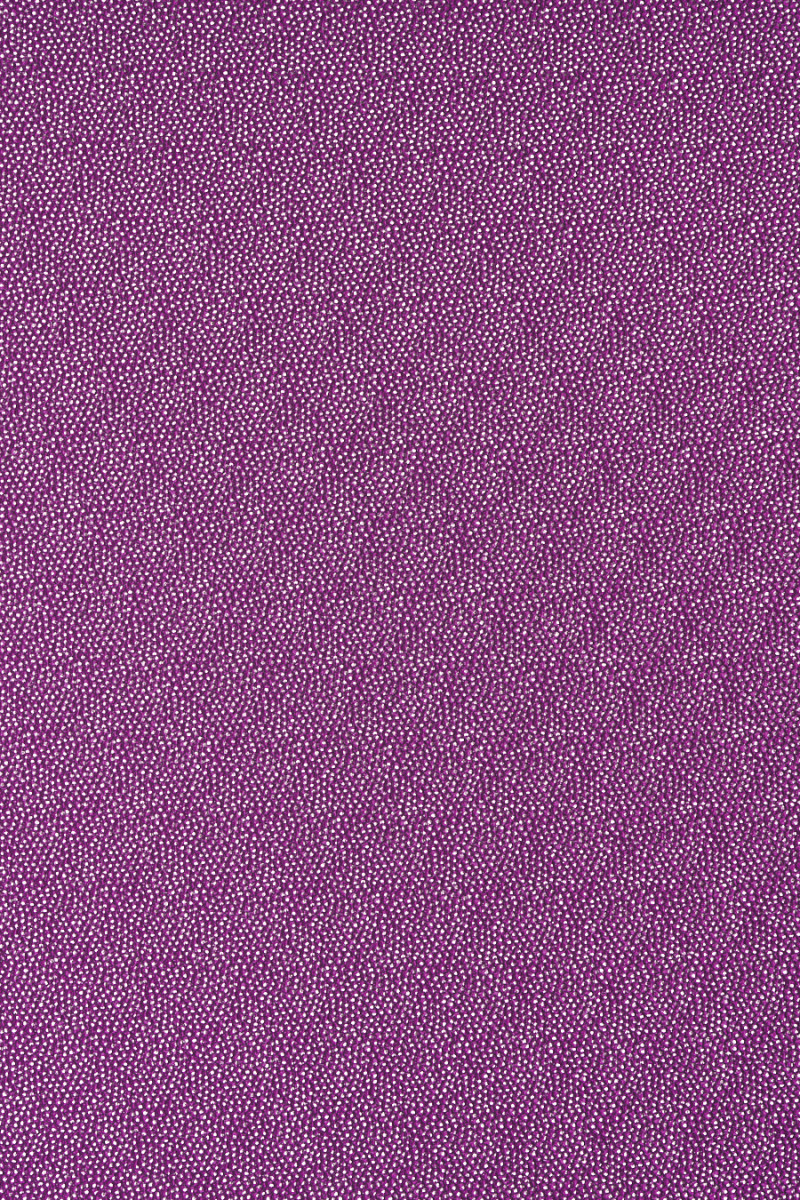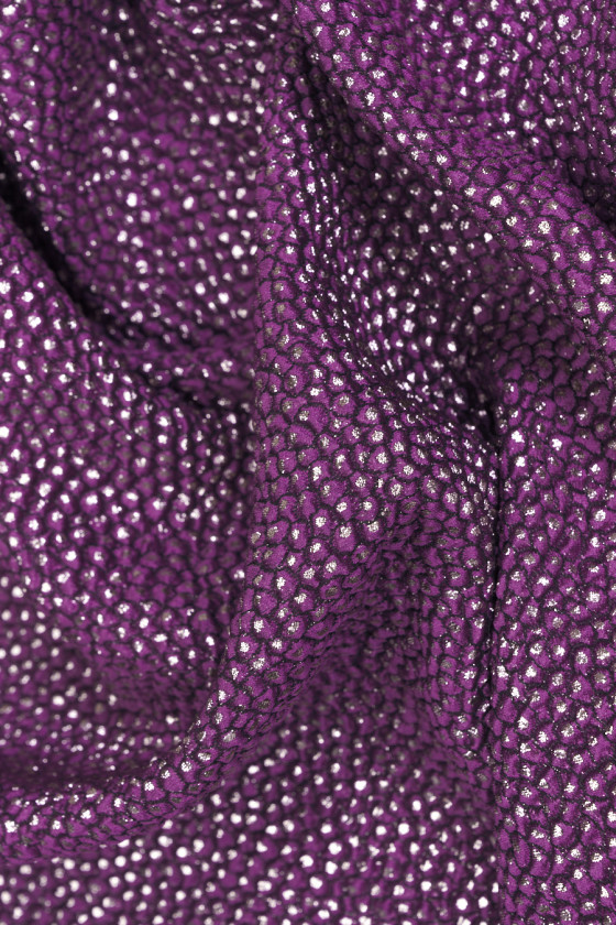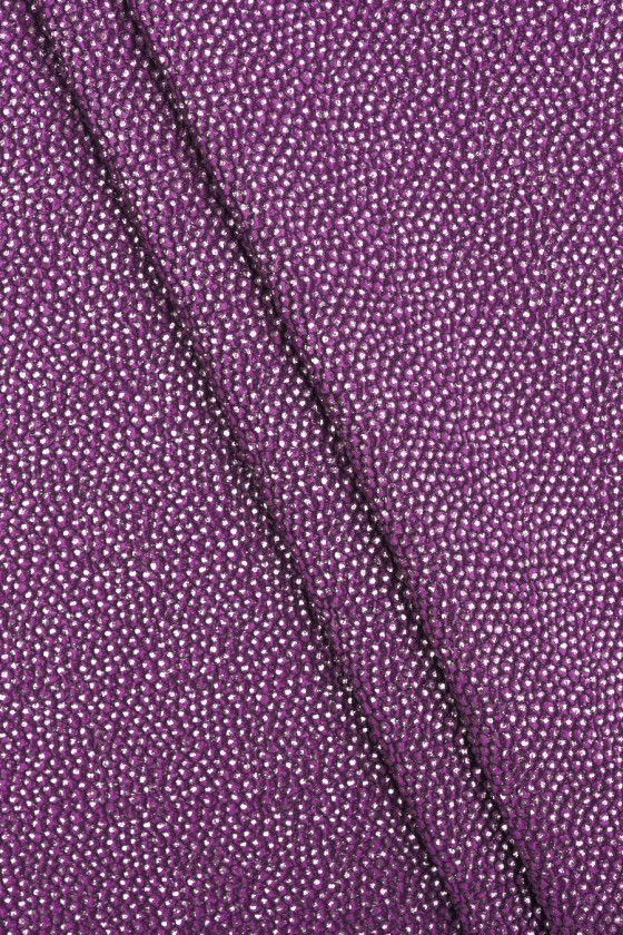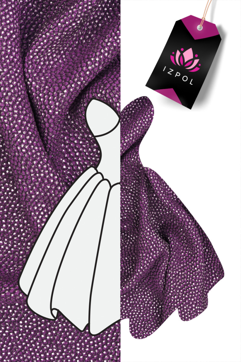 Italiensk jacquard kostume stof i dæmpet lilla. Stoffet har syninger lavet af sort tråd, hvilket skaber et lille geometrisk mønster med en konveks struktur. Det hele er dekoreret med en lurextråd, der skinner i guld og sølv afhængigt af lysets indfaldsvinkel. Materialet er af medium tykkelse, lidt stift og uelastisk. Et smukt forslag til folk, der kan lide skinnende og effektive stoffer.