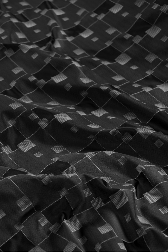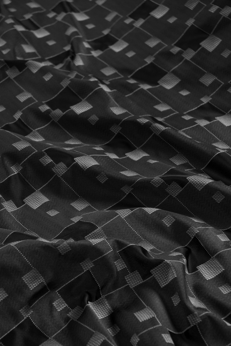 Jacquard vævet i et geometrisk mønster i tre farver - aske, grafit og sort. Stoffet er let stift, ikke-elastisk og tyndt Perfekt til en jakke, kjole eller tynd frakke.
