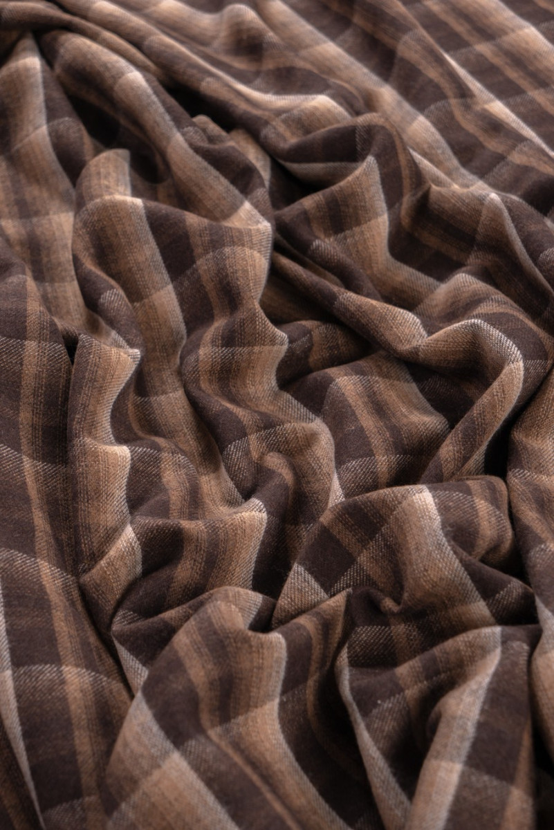 Et varmt stof med en brun og beige tern, som er perfekt til efterår-vinter cardigans eller kostumer. Blødt stof, med delikat hår, meget behageligt at røre ved