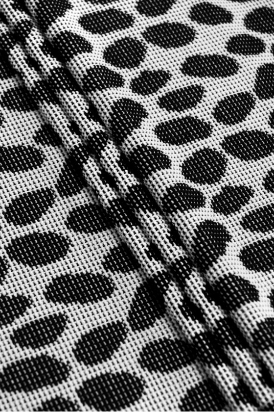 Italiensk dobbeltsidet stof med hvide og sorte lapper, vævet af naturlig uld med en blanding af polyester. Blødt, kødfuldt stof - perfekt til syning af en kjole, cardigan sweater. Vi anbefaler renseri.