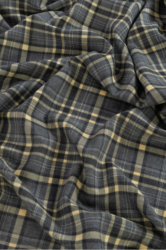 Italiensk kostumeuld med en blanding af polyester med et ternet motiv i grå- og gultoner. Et mellemtykt ikke-elastisk stof af efterår-vinter slagsen. Perfekt til at sy et kostume, kjole, nederdel, bukser eller jakkesæt.