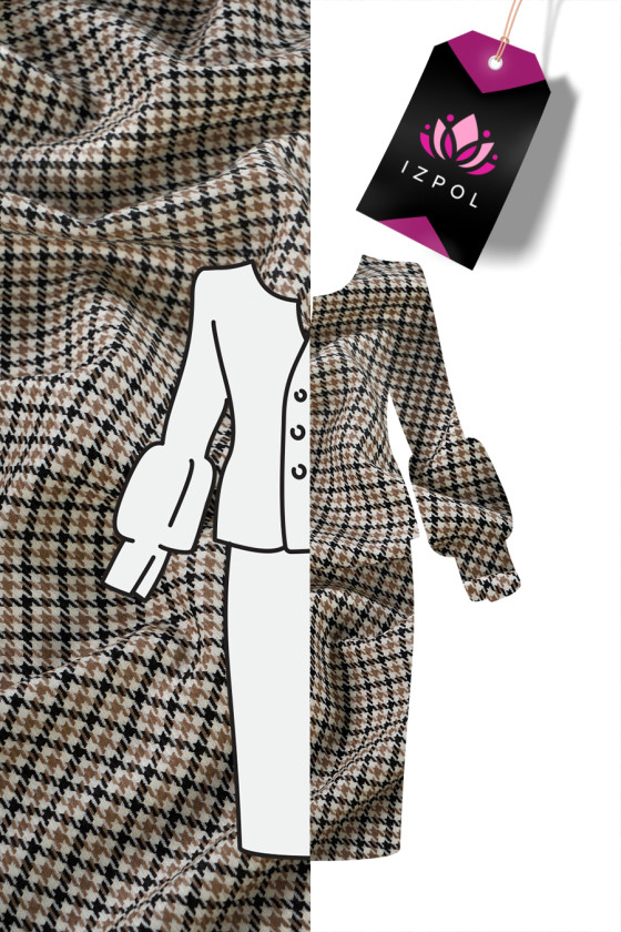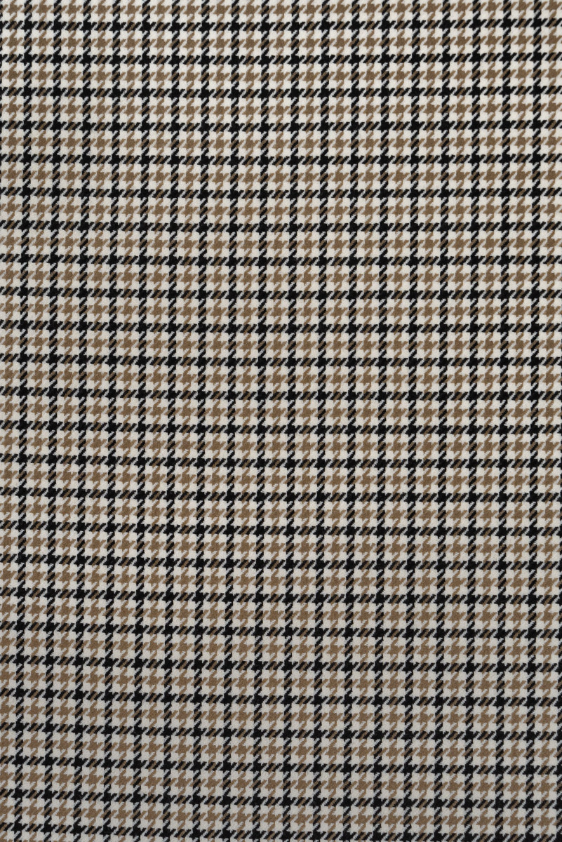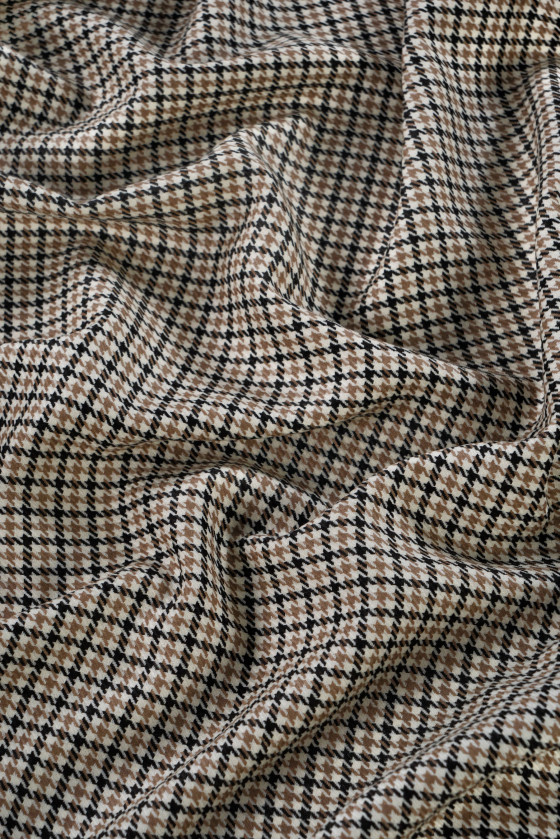 Italiensk kostumeuld i lys beige med et lille tern og houndstooth motiv (2 cm) i mørkebrun og kamelfarve. Tykkere, uelastisk, kødfulde stof af efterår-vinter slagsen.