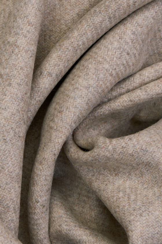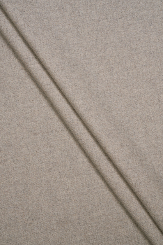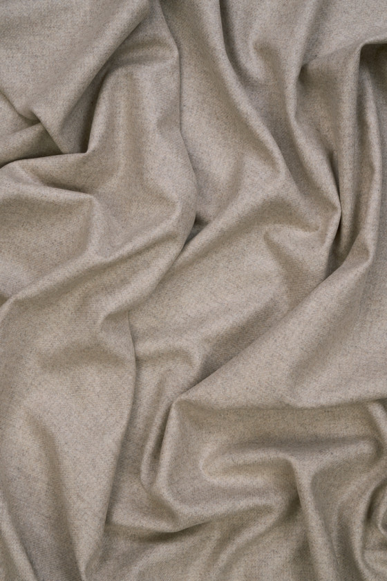 Italiensk 100% uldstof i beige med en delikat melange effekt. Stoffet er blødt, ikke-elastisk, mellemtykt, lavet af genanvendt fåruld. Perfekt til syning af kostume, bukser, nederdel, kjole og tynd frakke.