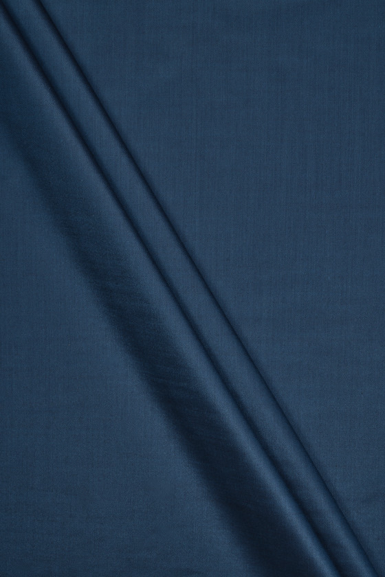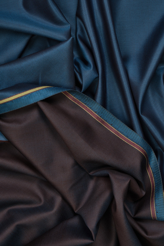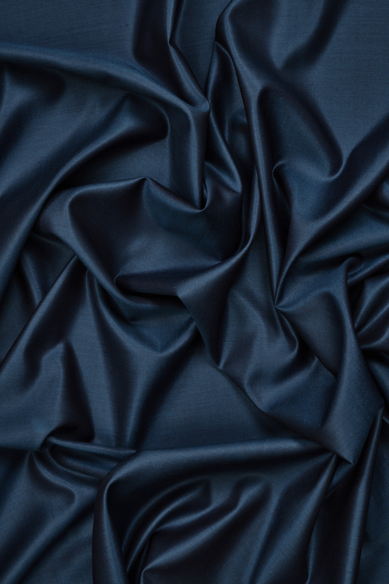Italiensk kostumestof vævet af uld og silke fra to farver tråde - blå og bordeaux, hvilket skaber en tofarvet. Et tætvævet stof, tyndt, ikke-elastisk, blødt, delikat i berøring og afsluttet med en subtil glans. Et smukt, klassisk forslag til jakkesæt, kjoler, nederdele.