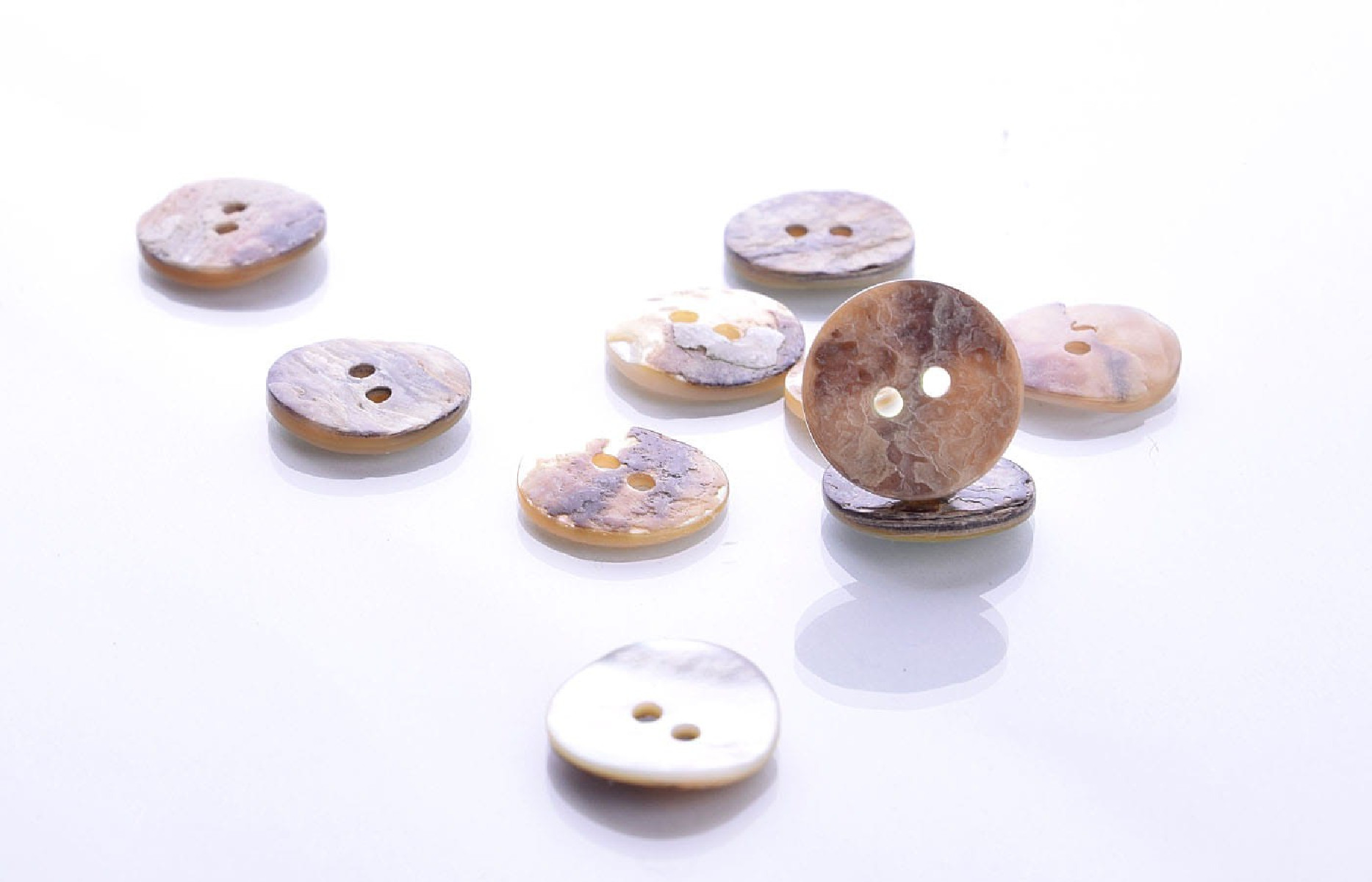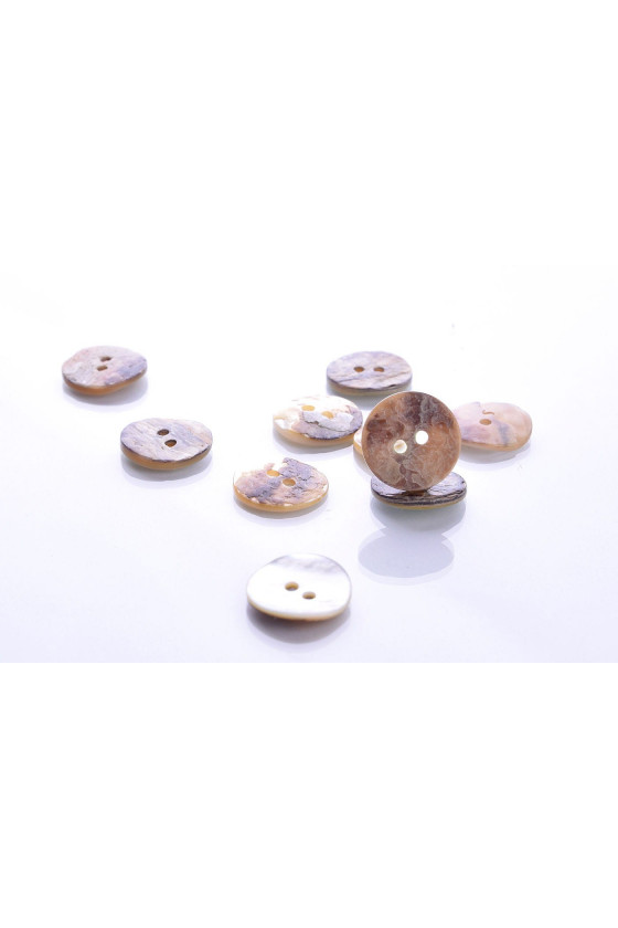En lille knap lavet af kunstig perlemor. Hver knap har et unikt mønster ca. 1,5 cm bredt.