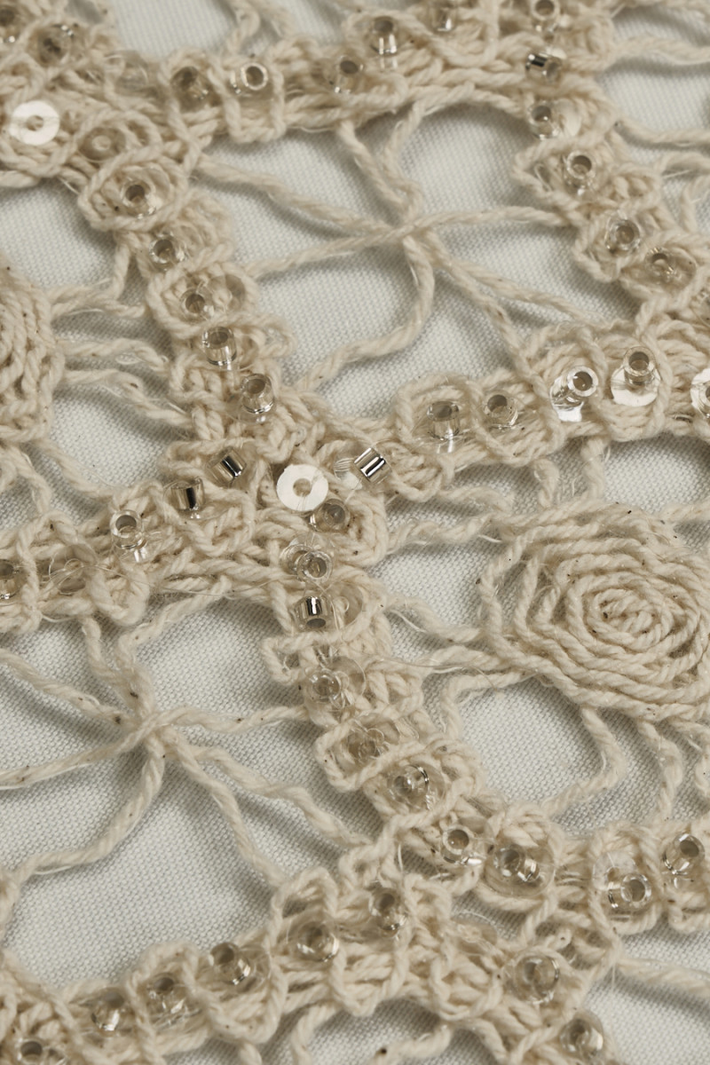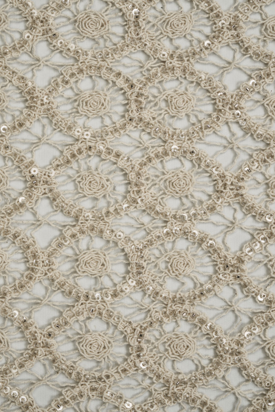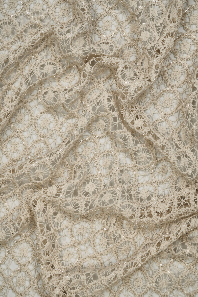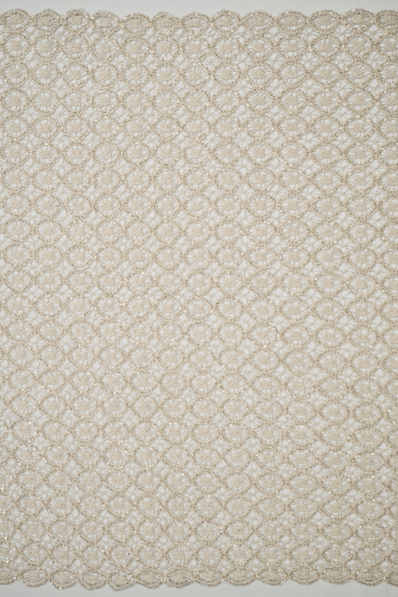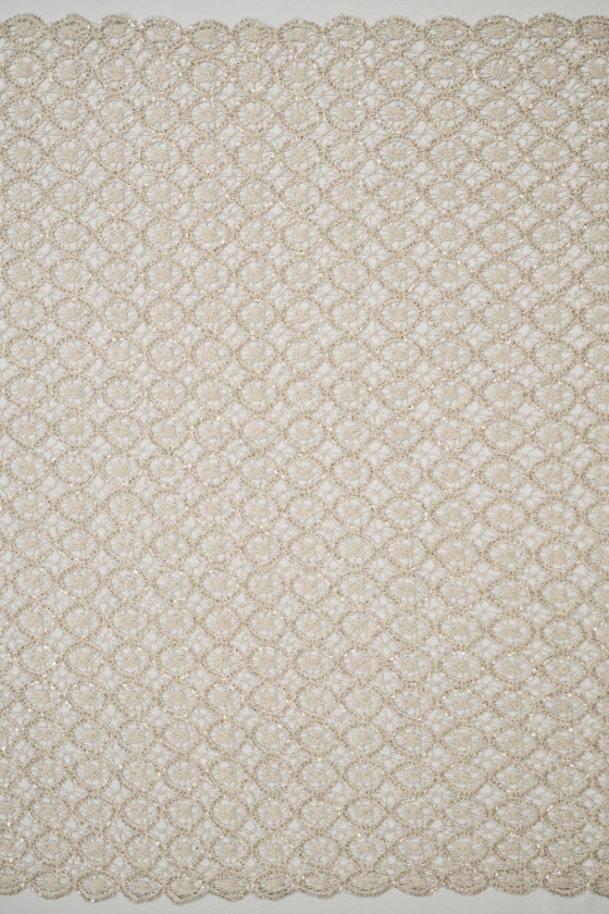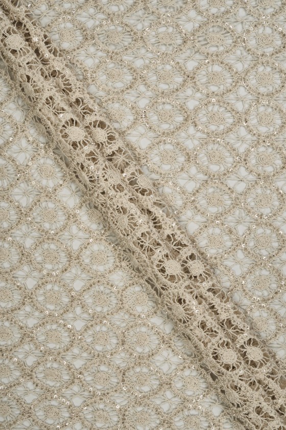 Italiensk blonde med gennembrudt mønster i lys beige dekoreret med sølvperler og transparente pailletter. Stoffet er blødt, gennemsigtigt, ikke-elastisk og har en delikat glans takket være de anvendte perler. Fantastiske blonder, som har mange anvendelsesmuligheder, kan bruges til at fremtrylle kjoler, bluser, nederdele, toppe og også bruges til finish.