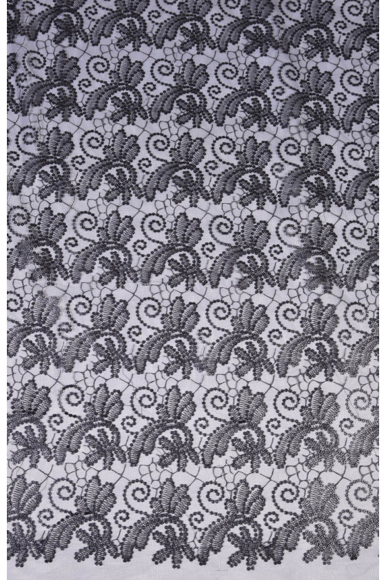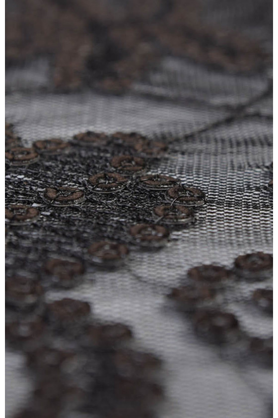 På sort tyl er der broderede blomster med pailletter lavet af øko-læder. Det hele skaber en smuk komposition.